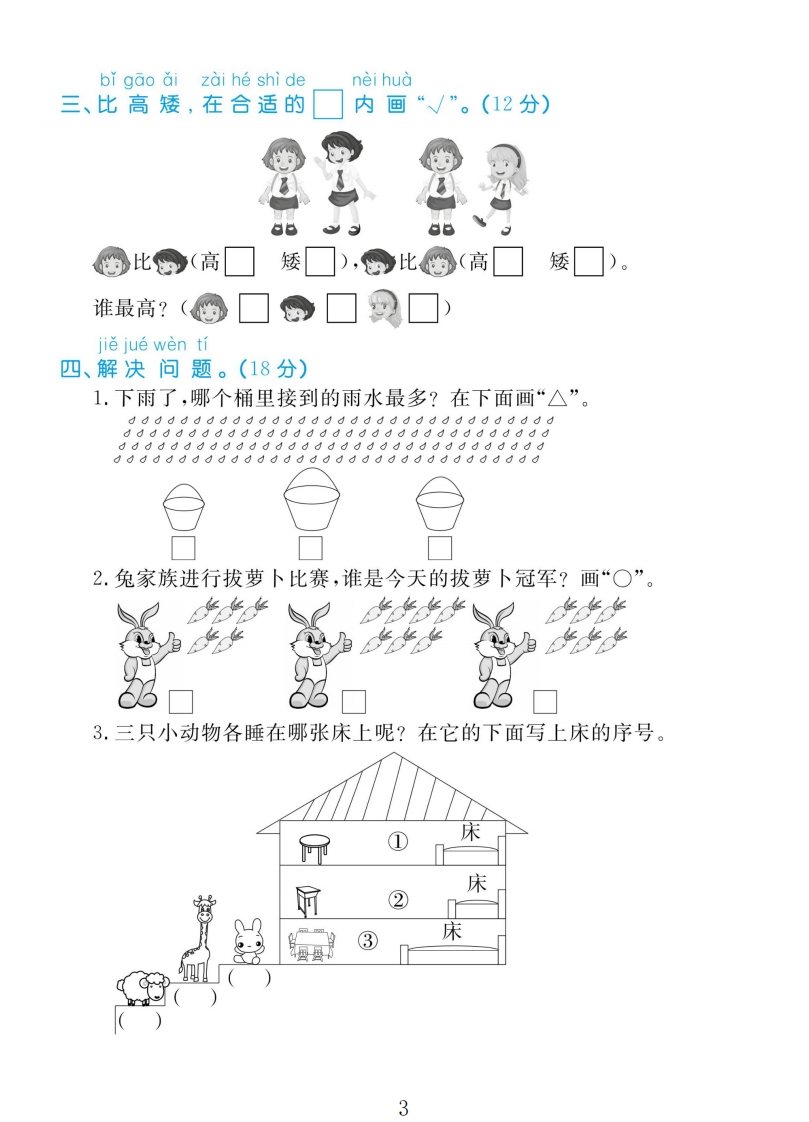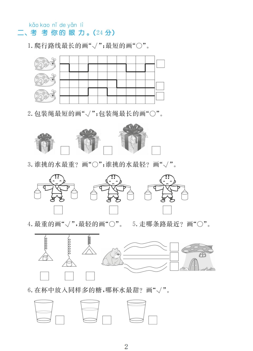 北师版一年级上册数学第二单元测试卷tangqi884天前发布关注私信12.33MB6页02613 第1页 / 共6页 第2页 / 共6页 第3页 / 共6页 试读已结束,还剩3页,您可下载完整版后进行离线阅读 北师版一年级上册数学第二单元测试卷此内容为付费资源,请付费后查看¥9.9¥19.9VIP会员免费立即购买您当前未登录!建议登陆后购买,可保存购买订单付费资源© 版权声明本站是一个信息分享及获取的平台,不确保部分用户上传资料的来源及知识产权归属,资料由老师投稿,公开渠道整理,网友上传,如果侵犯到您的权益,请联系客服删除THE END教师资料 文本预览 2025一年级上册数学第二单元测试卷第二单元测试卷时间:40分钟满分:100分郑题号二三四五附加题总分狲得分bi yi bi hua yi hua一、比一比,画一画。(18分)1.在长得高的下面画“/”。2.在短的后面画“/”。拟3.在大的下面画“/”4.在厚的下面画“√/”杀5.在轻的后面画“/”。6.在重的后面画“/”。1 查看更多 收起部分 喜欢就支持一下吧点赞13 分享QQ空间微博QQ好友海报分享复制链接收藏