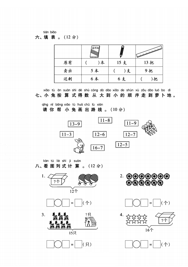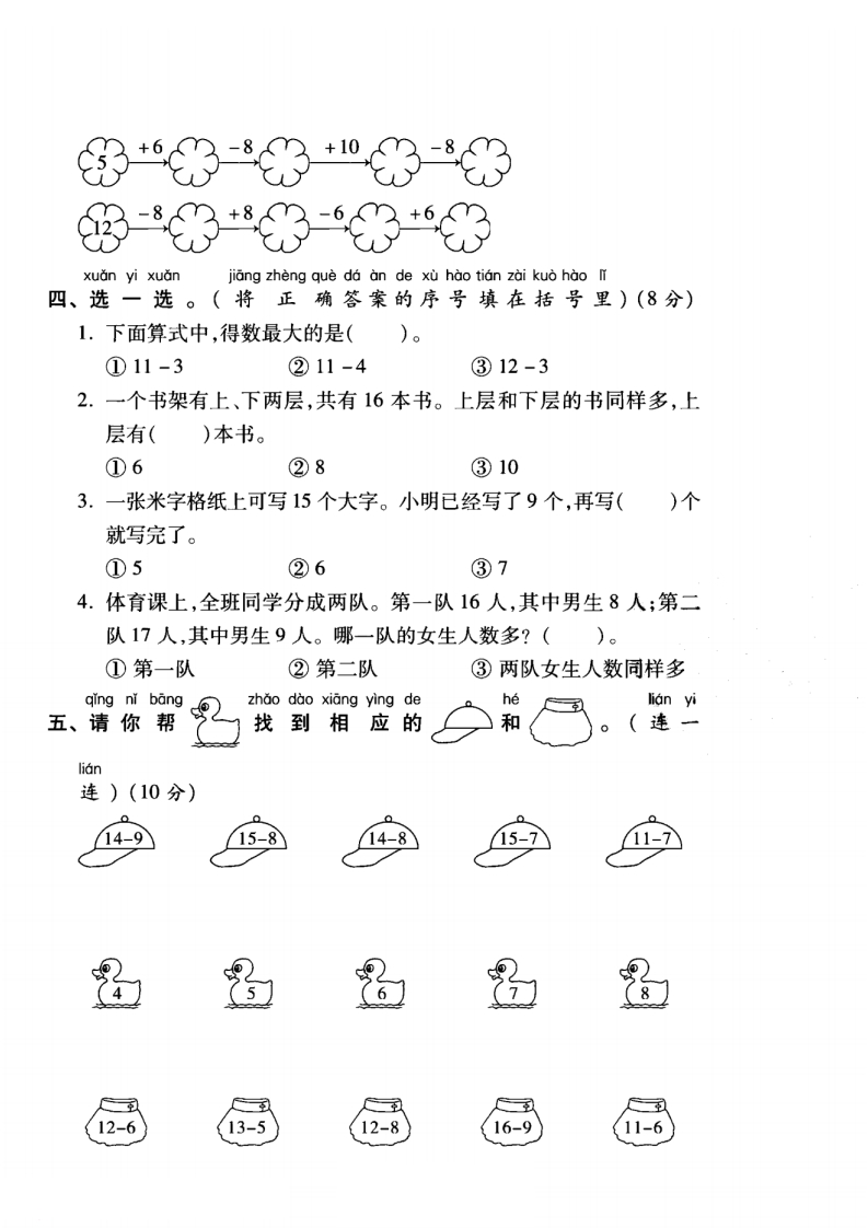一年级数学上册第六单元试卷(西师版)第六单元综合测评卷密时间:60分钟满分:100+10分学校题号三四五六七八九附加题总分得分kan tu tian kong班级一、看图填空。(6分)12团面面面姓名母厨母母国母=11围11-2=11-9=xiao mi feng cai hua mizàiI tian shanghuò二、小蜜蜂采花蜜。(在里填上“>”“<”或“=”)(9分)铁o13-5○715-9○413-7()5践18-9()1011-8(○314-7()11-4(615-813-6zai hua duo zhong tian shang he shi de shu三、在花朵中填上合适的数。(12分)