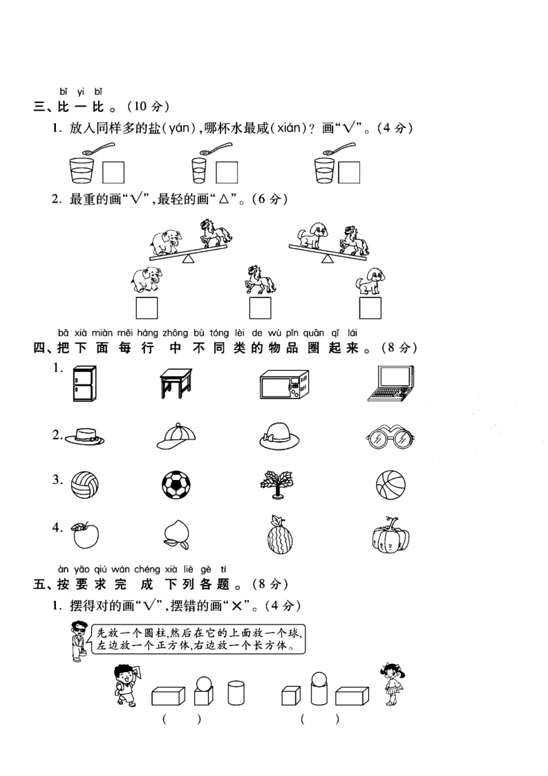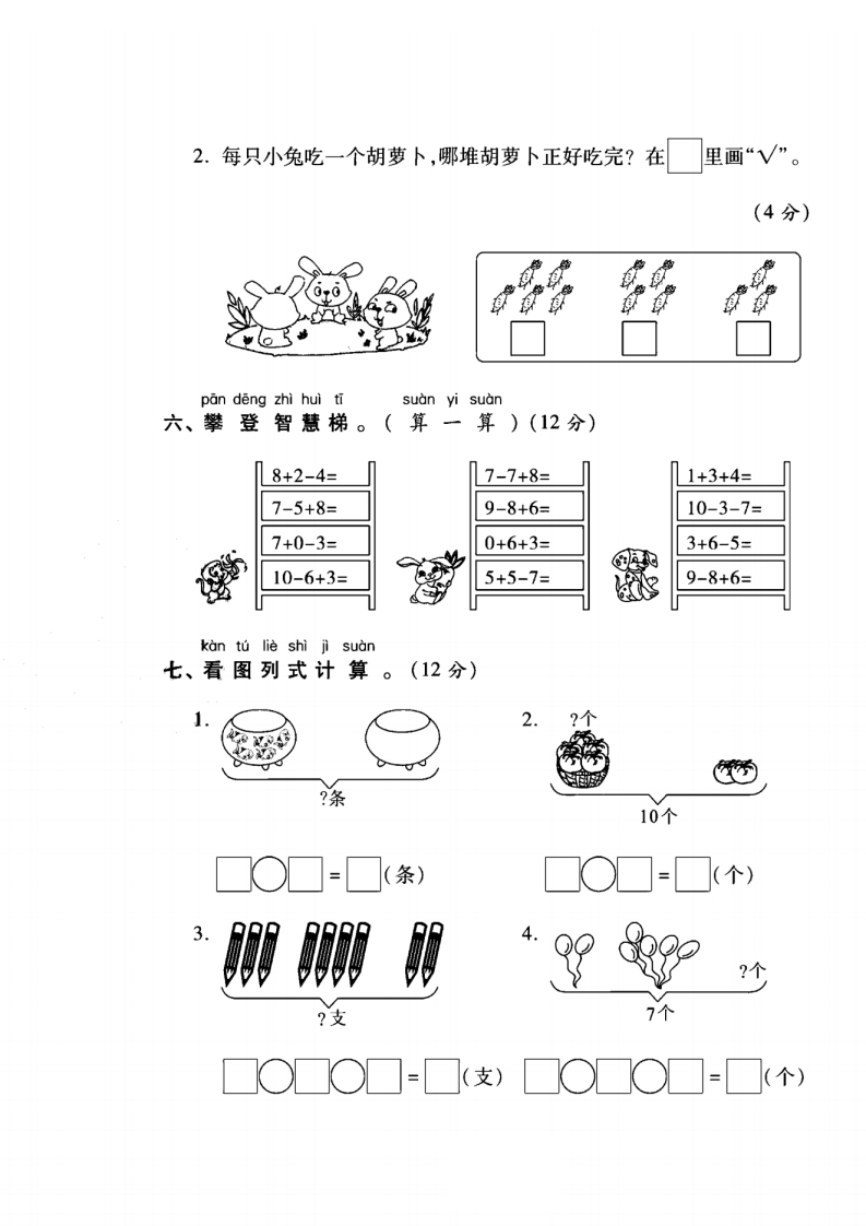 一年级数学上册期中模拟卷(西师版)期中冲刺夺分卷时间:60分钟满分:100+10分题号四五六七八附加题总分得分kan ka pian tian yi tian一、看卡片填一填。(22分)1▣0531069第11.一共有()个数。2.这些数中,最小的数是(),最大的数是()。3.比4小的数有(),比7大的数有(4.第5个数是(),5是第()个数。5.按从大到小的顺序排一排:()>()>()>()>()>()>()6.从中任选出3个数组成两道加法算式和两道减法算式。(8分)=fen yi fen tian yi tian二、分一分,填一填。(8分)