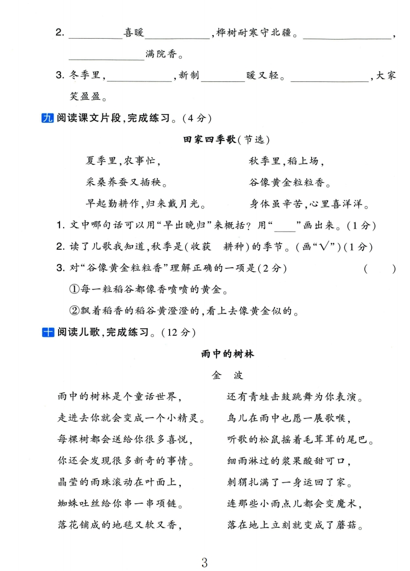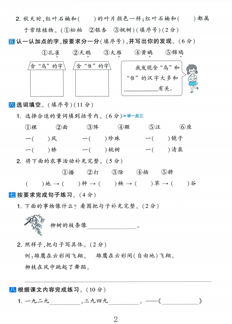 2025人教版二年级语文上册第二单元测试卷第二单元测试卷时间:90分钟满分:100分口给加点字选择正确的读音,画“V”。(9分)》孙翠竹(cuichui)桦树(hudhua)场院(chngchang)一艘(soushou)诚实(chencheng)装扮(zuangzhuang)雄鹰(yinying)看守(shusou)一行字(xinghang)日读拼音,写字词。(7分)shijiebǎohùxinkǔnongshishen chù数yuanguntonghao校艺术节上,一少年齐声吹响目用“V”选出正确的汉字。(8分)几年不见,老屋门前的(杨扬)树变(画化)真大呀!当(初出)瘦瘦小小的一棵,现在长得又粗又壮,常有人在树下(休体)息。四观察下面的植物信息卡,完成练习。(14分)名称:红叶石楠习性:常绿小乔木,耐寒,春秋两季嫩叶鲜红,色彩艳丽持久。1.用部首查字法在字典中查信息卡中的加点字,并填空。(12分)要查的字部首除部首外有几画字的页码读音楠嫩持1
