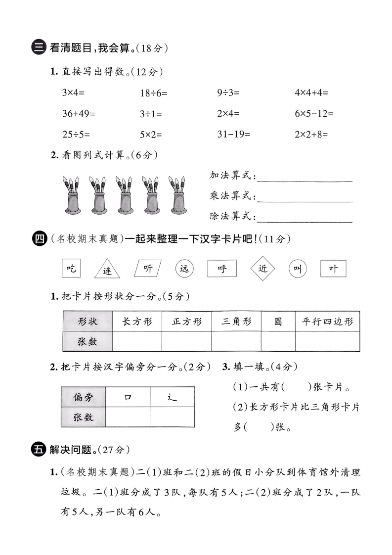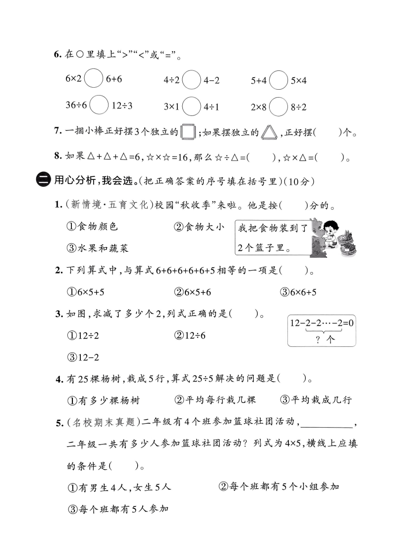 2025-2026学年人教版二年级上册数学综合素养评价期中试卷景时间:60分钟满分:100分题序三四五总分等级孙蜘得分开动脑筋,我会填。(每空1分,共34分)1.早晨,当你面对太阳时,你的左面是()方,右面是()方,背的对着()方。2.(新情境·地域特色)奉化水蜜桃是中国四大传统名优桃之一。細长(1)有()盘桃,每盘()个,共有()个桃。用加法计算,列式是();用乘法计算,列式是()区(2)一共有()个桃,平均分成()盘,每盘()个。列式是()。)个桃,每盘()盘。列式是管数(3)一共有()个,分成了((3.照样子填一填。杯694.根据口诀“五六三十”写出两个乘法算式和两个除法算式。岛栏5.乘数都是5,积是():被除数是6,商是1,除数是()。