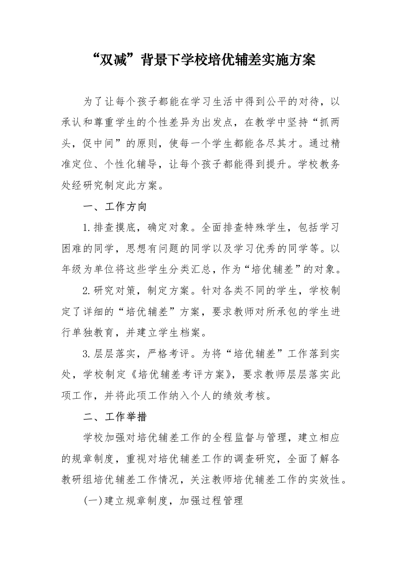 “双减”背景下学校培优辅差实施方案为了让每个孩子都能在学习生活中得到公平的对待,以承认和尊重学生的个性差异为出发点,在教学中坚持“抓两头,促中间”的原则,使每一个学生都能各尽其才。通过精准定位、个性化辅导,让每个孩子都能得到提升。学校教务处经研究制定此方案。一、工作方向1.排查摸底,确定对象。全面排查特殊学生,包括学习困难的同学,思想有问题的同学以及学习优秀的同学等。以年级为单位将这些学生分类汇总,作为“培优辅差”的对象。2.研究对策,制定方案。针对各类不同的学生,学校制定了详细的“培优辅差”方案,要求教师对所承包的学生进行单独教育,并建立学生档案。3.层层落实,严格考评。为将“培优辅差”工作落到实处,学校制定《培优辅差考评方案》,要求教师层层落实此项工作,并将此项工作纳入个人的绩效考核。二、工作举措学校加强对培优辅差工作的全程监督与管理,建立相应的规章制度,重视对培优辅差工作的调查研究,全面了解各教研组培优辅差工作情况,关注教师培优辅差工作的实效性。(一)建立规章制度,加强过程管理