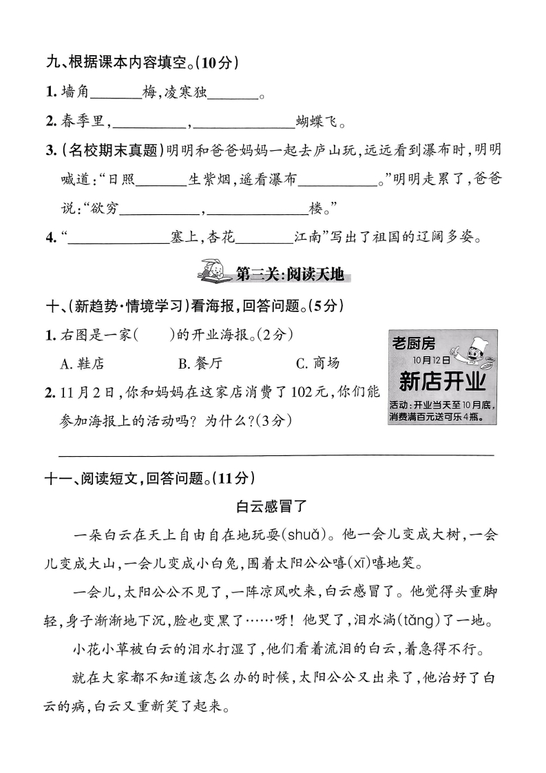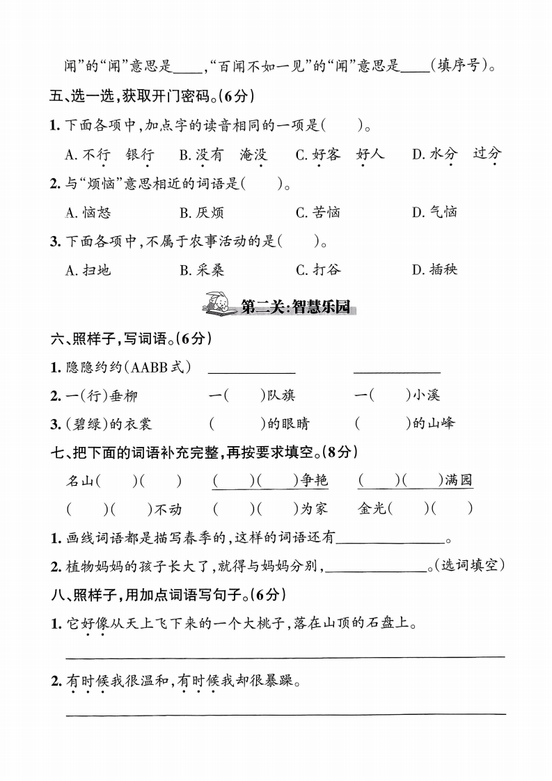 2025-2026学年二年级上册语文情境素养卷期中情境素养卷时间:60分钟满分:100分小朋友们,快站上赛场,展示你的学习成果,快乐闯关吧!郡弥第一关:知识密室一、拼一拼,写一写。(15分)xiancheng shiXuduoming sheng1.视频展了这座的pengyougaosubǎohùbanfǎ2.了我几个环境的毁封二、用“V"”为加点字选择正确的读音。(6分)倒映(yin ying)环绕(1ǎ0rào)变更(genggeng)旅行(IǔIǚ)帆船(fanfan)守护(shǒusǒu)三、(名校期末真题)根据拼音在括号中写出正确的汉字。(6分)yang在海()的那边,有一片()树林。蠻hud他用彩笔()出了小树的变()。线zhi一()鸟儿站在树()上眺望远方。四、(名校期末真题)按要求填空。(6分)1.“处”的第二笔是。“很”的第四笔是2.“闻”用部首查字法查字典,先查部首,再查画。“闻”的意思靠有:①听见;②听见的事情,消息;③出名,有名望;④用鼻子嗅气味。“新