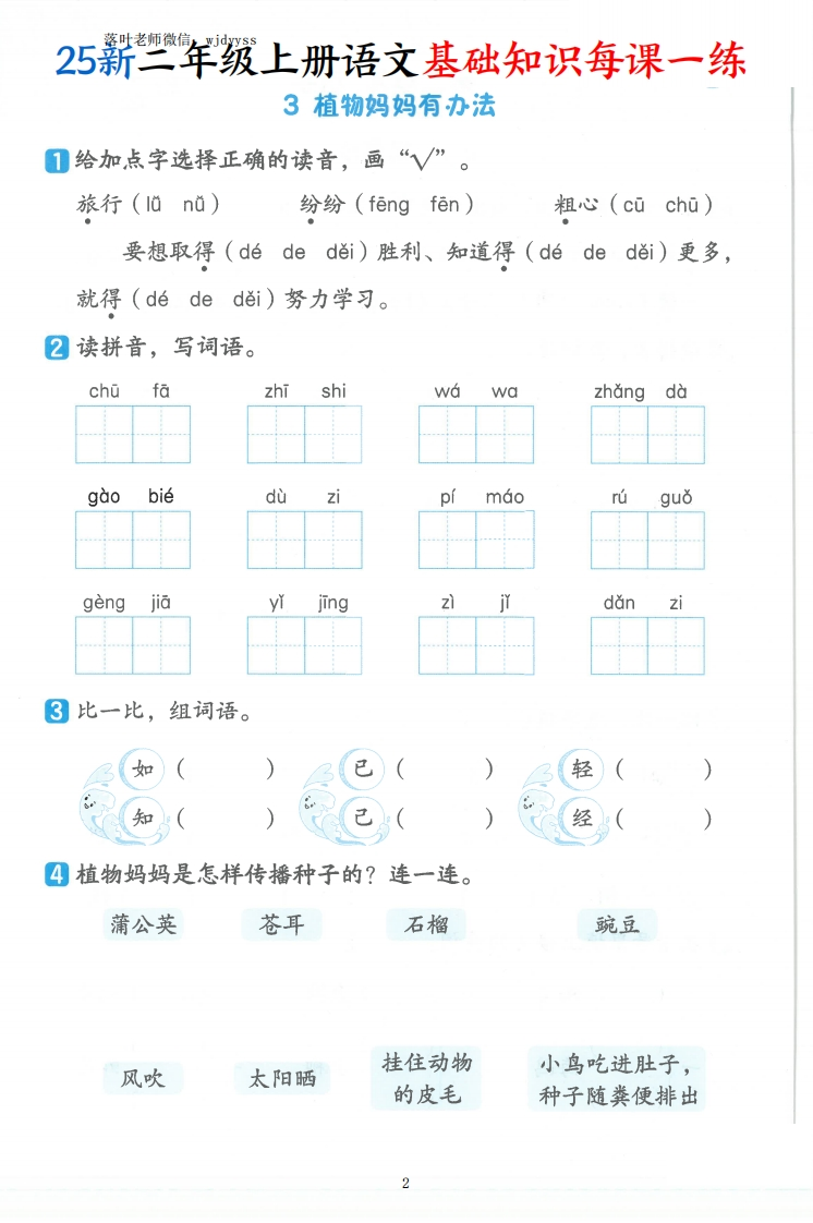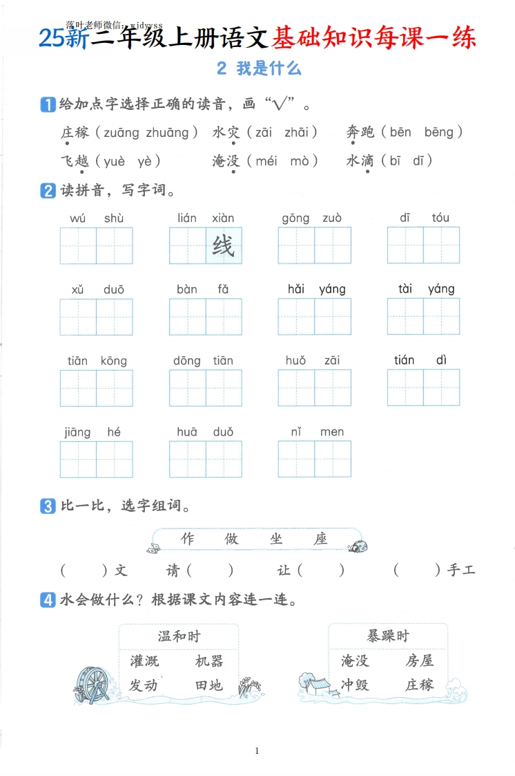 落叶老师微信:wjdyyss25新二年级上册语文基础知识每课一练1小蝌蚪找妈妈①读一读,用“√”画出加点字的正确读音。捕食(bǔpǔ)】脑袋(nǎoIǎo)欢迎(ying yin)爷爷是一位教(jia0jiào)师,他教(jia0jiào)会了我许多知识。2读拼音,写词语。tiaochang duanyǎnjingnǎshenkànjiannabianXuěbihaiziliangtiankuandashenme3连一连,读一读。甩着碧绿的眼睛鼓着长长的肚皮披着雪白的尾巴露着大大的衣裳④小蝌蚪是怎样长成青蛙的?按顺序排列正确的是(A.①②③④B.②①③④C.③①②④D.②①④③0