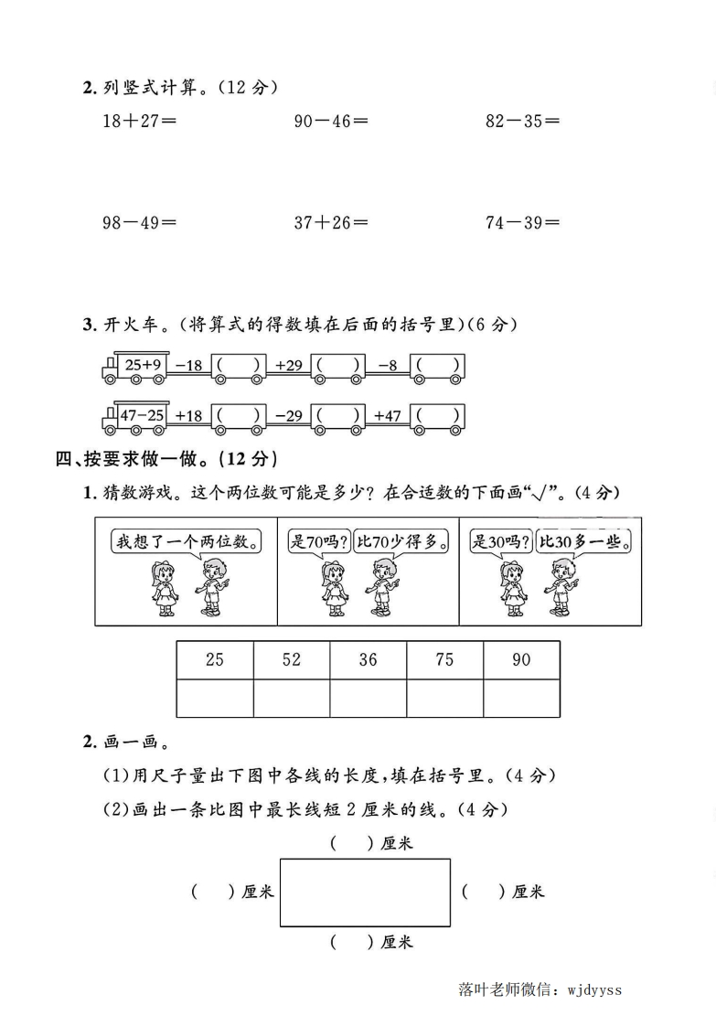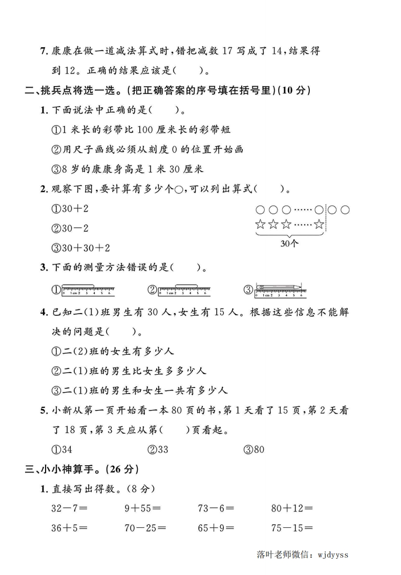 2025北师大版二年级数学上册第一次月考卷(检测范围:第一、二单元)(时间:40分钟满分:100分)评价:一、认真填一填。(28分)1.在括号里填上“厘米”或“米”。都手掌宽约铅笔长约叔叔身高约7(15()1()75(2.摘苹果。(在为中填上“>”“<”或“=”)6厘米6米80厘米8米65厘米56厘米製1米99厘米4米3米4厘米5米40厘米75厘米+25厘米1米1米-55厘米55厘米3.心中有数。(○中最大能填几?)0+20<72○-9<8162>○+3826>2-35哉43>19+○90-○>3215<94-47->324.油画棒长()厘米,粉笔长()厘米。5.猜猜我是谁。招我比56多23。我比34少1534比我少158孙)()6.82-4☐,要使差的十位上是3,☐里最大填()。46+3☐要使和的十位上是8,☐里最小填()。落叶老师微信:wjdyyss