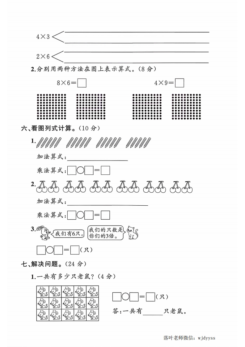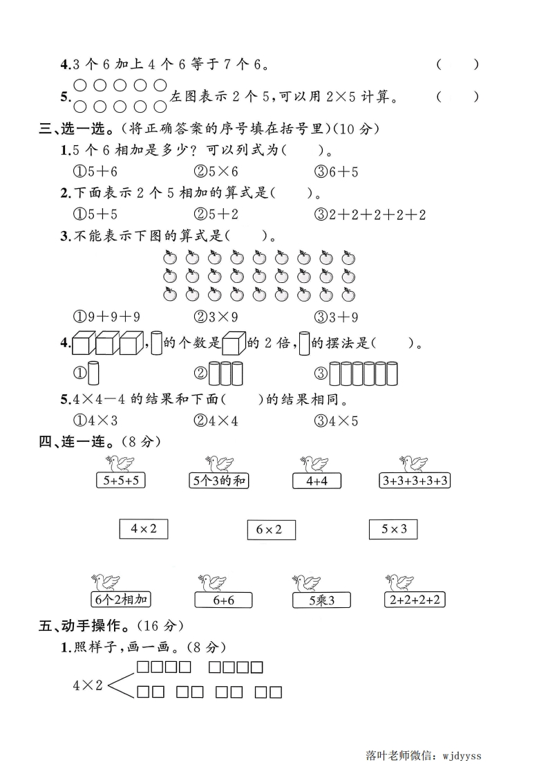 2025北师大版二年级数学上册单元测试卷第三单元测试卷时间:60分钟满分:100分+10分题序三四五六七附加题总分郑得分一、填一填。(第7题4分,其余每空1分,共27分)1.把7+7+7+7改写成乘法算式是()或(),读作弥()或()。2.4×3=12可以表示()个()相加或()个()相加;在封这个乘法算式中,4是(),12是()。3.2个9相加,和是();2和9相加,和是()。线4.3个8相加,写成加法算式是(),写成乘法算式是()或()。内5.一个乘数是7,另一个乘数是6,这个算式可以写作(),读作()。6.不0123456789101112131415小青蛙1步跳2格,2步跳()格,3步跳()格,5步跳要()格。17.把加法算式改写成乘法算式。(4分)答靠3+3+3+3=☐×☐1+1+1+1+1+1=×■题5+5+5+5+5=☐×☐8+8=☐×☐8.小壮今年7岁,爸爸的年龄是小壮的5倍。爸爸今年()岁。:9.(1)☆+☆+☆=15☆=():(2)△+△+△+△=16△=()二、判一判。(对的画“√”,错的画“X”)(5分)(B-管)元1.因为2十2=2×2,所以3+3=3×3。2.5个6相加的和与6个5相加的和一定相等。()3.4X2和2×4都读作4乘2。(落叶老师微信:wjd