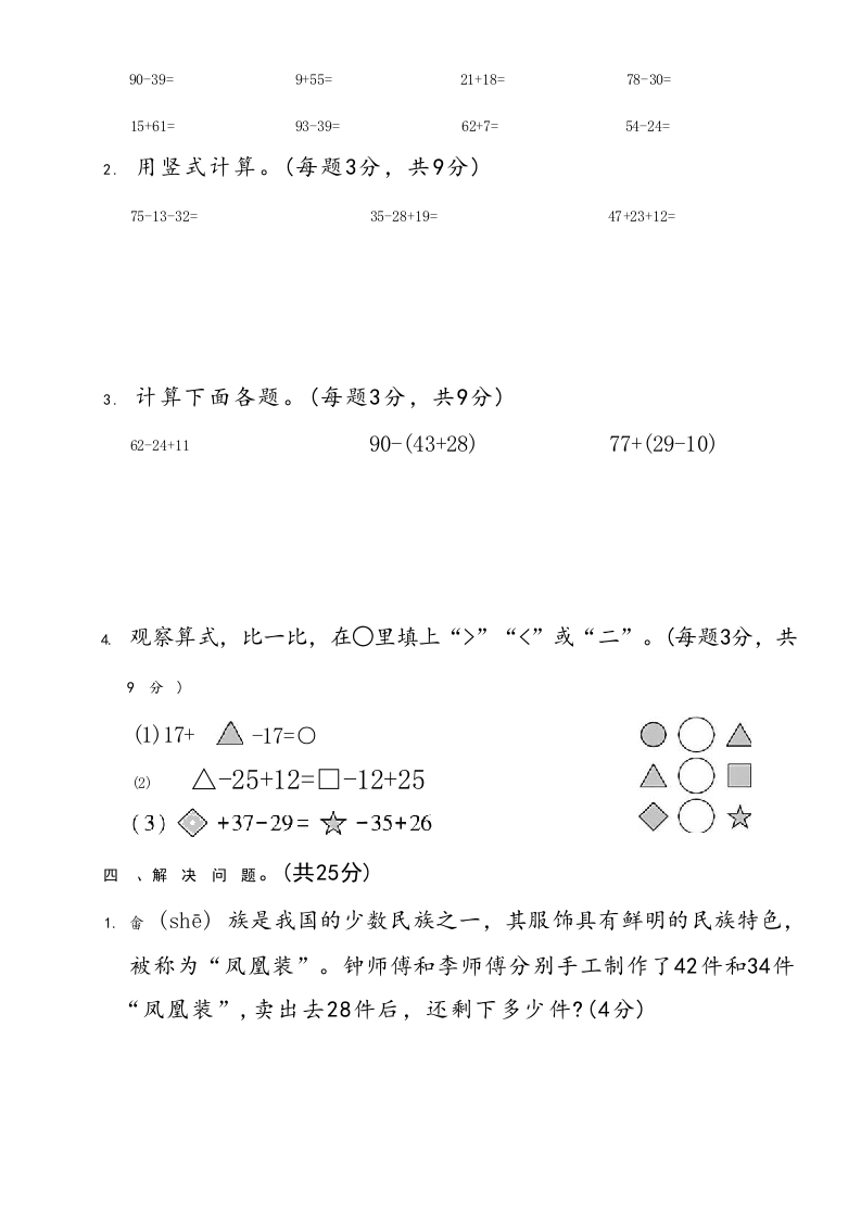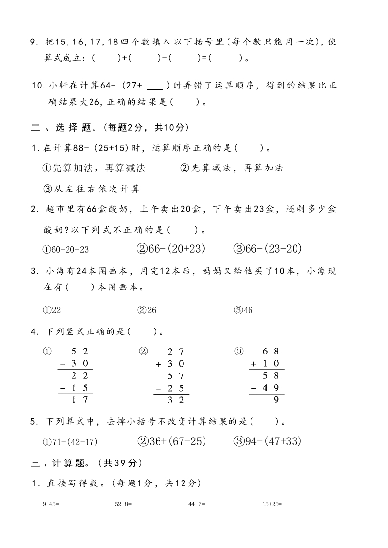 2025秋季冀教版二年级上册数学试卷第一单元达标测试卷时间:40分钟满分:100+10分题序三四附加题总分得分一、填空题。(每空1分,共26分)1.3个加数都是23,和是();86连续减两个12,得数是()。2.计算35+20-16时,先算()法,再算()法,结果是();计算35+(20-16)时,先算()法,再算()法,结果是()。3.75减去45再加上10,列式计算为();75减去45和10的和,列式计算为()。4.甲数是12,乙数是20,丙数比甲数和乙数的和多45,丙数是()。5.航航家有杏树32棵,桃树比杏树多15棵,航航家有桃树和杏树一共()棵。6.在○里填上“>”“<”或“=”。45+26o46+2514+21+47o21+14+4790-56033+5786-39+30o86-(39+30)7.张老师要带领学生参观博物馆,全班共有40名学生,但有两名学生请了病假,张老师一共要买()张门票。8.找规律填数。100,90,95,85,90,80,85,(),(),(),()。