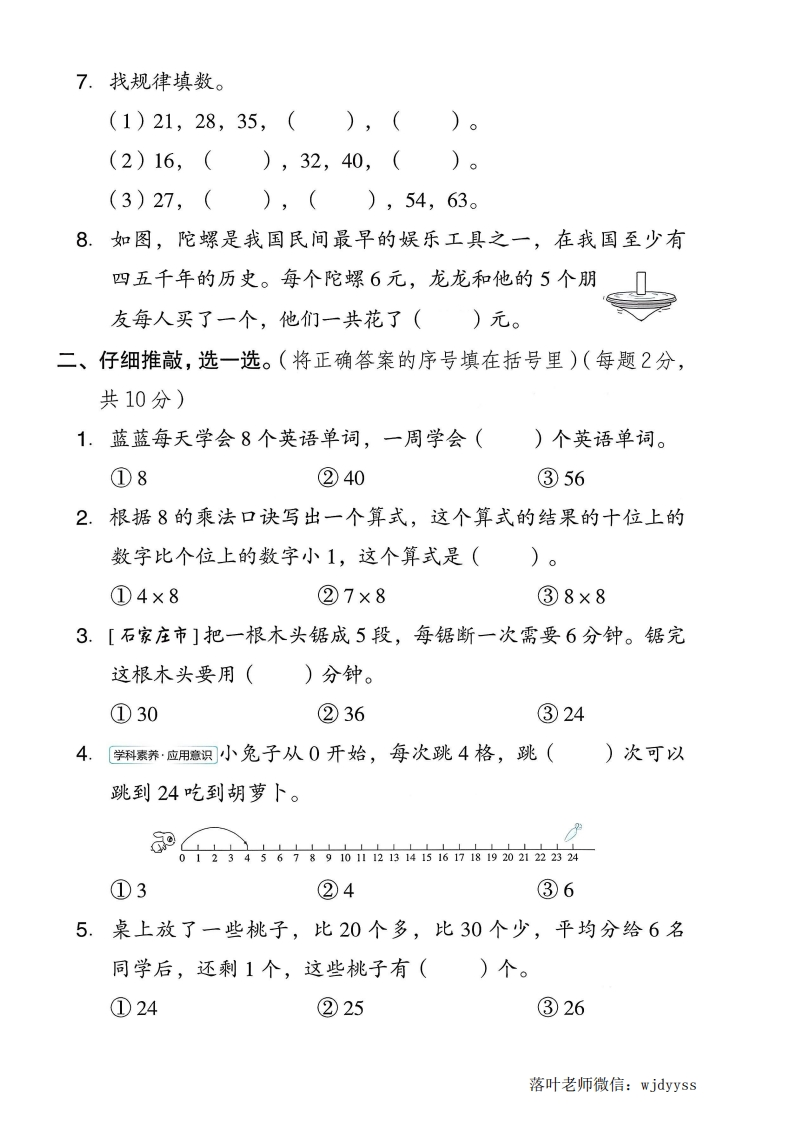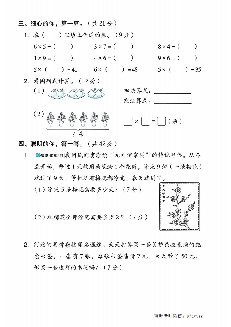 2025冀教版二年级数学上册单元测试卷第二单元测试卷时间:60分钟满分:100分+10分一、认真审题,填一填。(每空1分,共27分》如1.下图表示()个(),列乘法算式为(用到的乘法口诀是()。的鸭汽鸭鸭鸭家?根手指2.新情境经典名著填口诀,讲故事。《西游记》讲述了唐僧师徒历经()难去西天取经的故事,途中孙悟空施展()般变化,猪八戒蜜拿着九齿钉耙,不管(),把妖怪打得落花流水。倒3.写出4个积是12的乘法算式。()()()()4.跨学科语文下面的诗是清代诗人郑燮(xè)写的《咏雪》,这首诗里一共有()个汉字,列乘法算式是(一片两片三四片,五六七八九十片。千片万片无数片,飞入梅花都不见。5.汉字“木”有4画,鞋品牌“木林森”的名字共有()画。6.括号里填几才能使每张卡片上的式子的得数相等?3×86×7()x9)×8+8)×7+73×9+9)×8-8)×7-7)×9-9落叶老师微信:wjdyyss