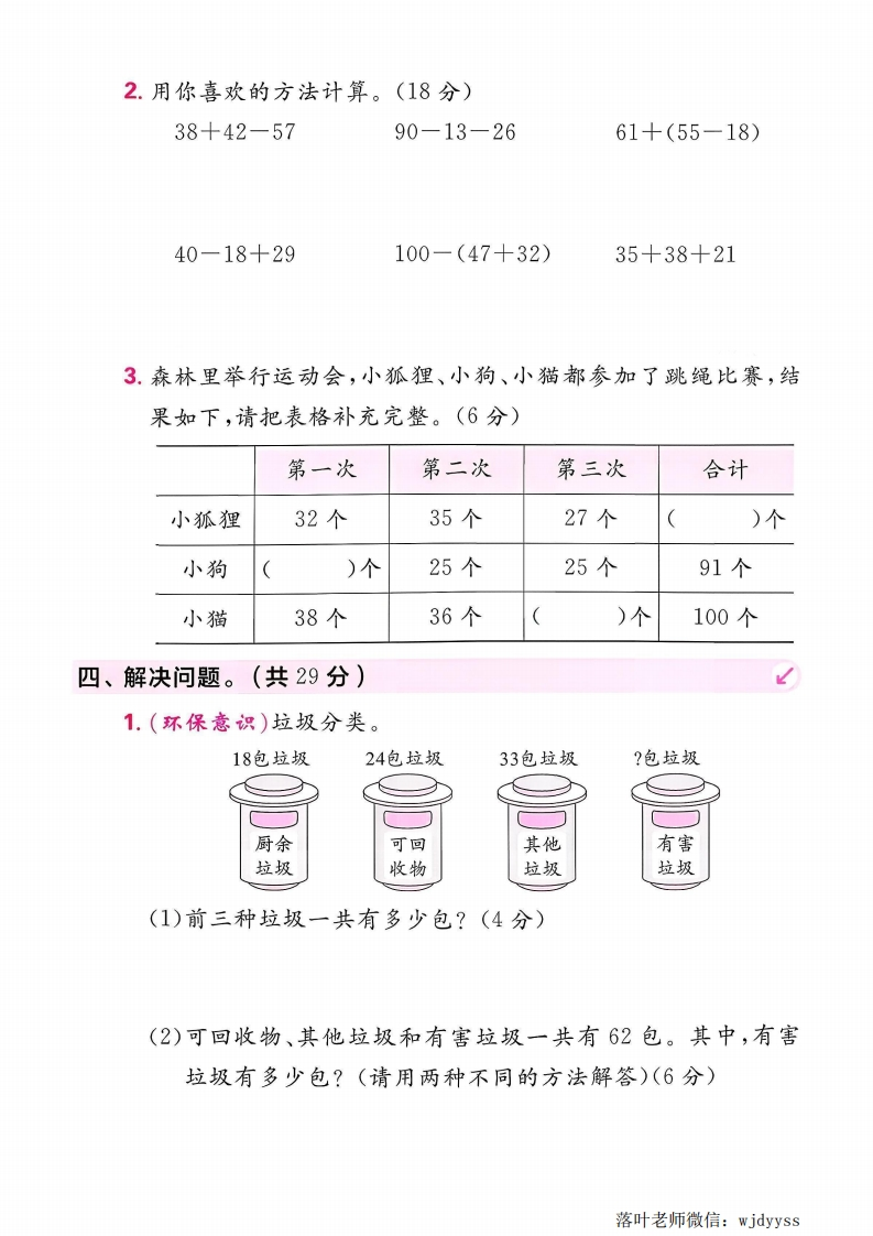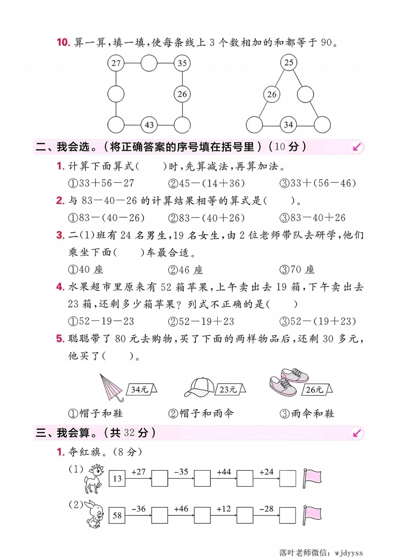 2025冀教版二年级数学上册单元测试卷第一单元测试卷时间:60分钟满分:100分一、我会填。(每空1分,共29分)1.计算82一(28十35)时,应该先算()法,再算()法,结果是()。2.计算82-28+35时,应该先算()法,再算()法,结果是()。3.在○里填上“>”“<”或“=”。72-8+10()7530+44-6()6894-82+20()3063+20-533027+45+16()10051+39-18()704.在()里填上合适的数。80-28-()=17()-(12+39)=1846+()+17=9175-28+()=845.(情境题)蒲公英妈妈为自己的娃娃准备了降落伞。一阵风吹走了26个,又一阵风吹走了16个,还剩33个,蒲公英妈妈一共有()个娃娃。6.(情境题)春节送福。爷爷写了50张<福,送了28张,又写了16张,还剩()张。7.(情境题)二(1)班同学在教师节当天折了90只千纸鹤送给老师,送给李老师28只,送给张老师38只,还剩()只。8.梓豪拿100元买下面不同的两样物品,最多剩()元,最少剩()元。足球36元篮球48元排球29元9.乐乐的前面有27人,后面有15人,这一队共有()人。落叶老师微信:wjdyyss