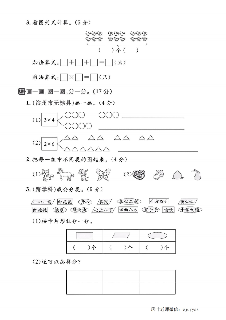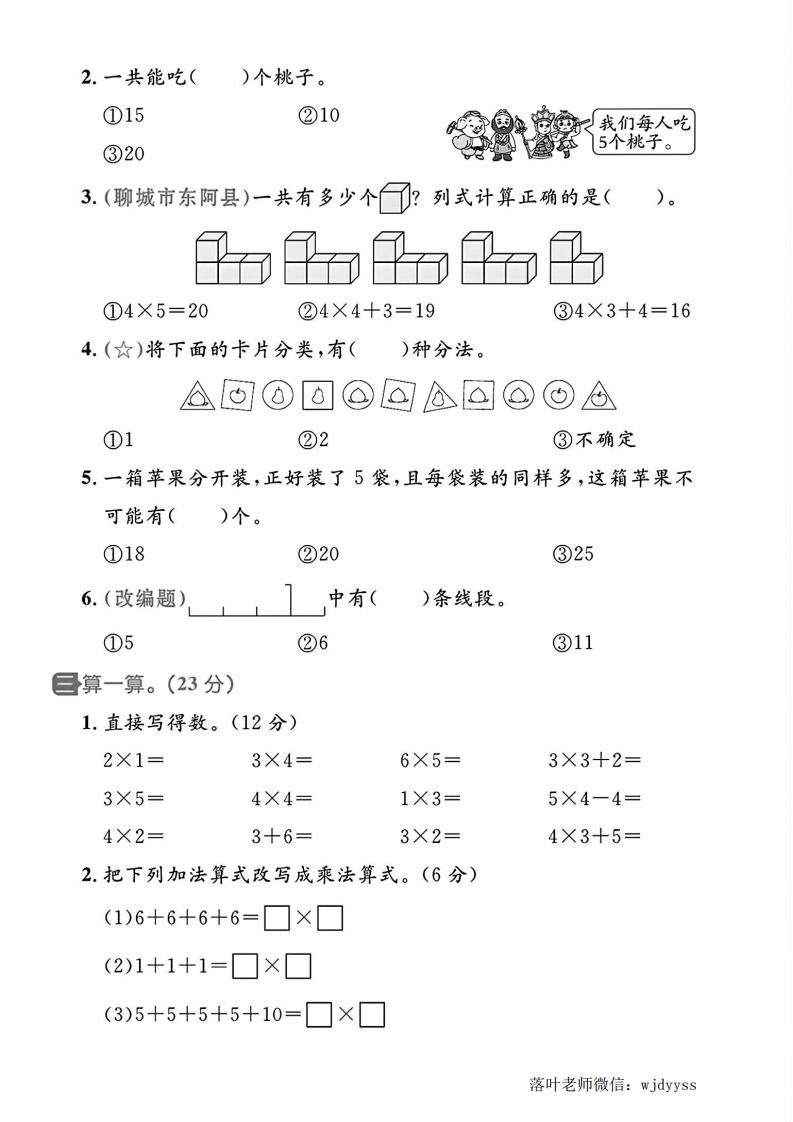 青岛63制二年级数学上册第一次月考卷第一次月考卷(考查范围:第一、二单元)密⊙测试时间:40分钟⊙满分:100分+卷面:5分评价毁二填一填。(24分)1.4+4+4,表示()个()相加,写成乘法算式是(其中相同的加数是(),相同加数的个数是()。2.()X6=6,这个算式用到的乘法口诀是(3.一个乘数是6,另一个乘数是7,积是42,写成乘法算式是蠻(),用到的乘法口诀是()。4.在○里填上“十”“-”或“X”。2○6=18○618○2=5○427○9=3○65.每张桌子可以围坐6人,如果再来4人就能围坐满5张桌子。现在一共有()人入座。p6.1只青蛙1张嘴,2只眼睛()条腿,呱呱呱呱张大嘴。4只青蛙()条腿,扑通扑通跳下水。将上面的儿歌补充完整,并按要求写算式。加法算式:()乘法算式:(7.数图形。(4分)舞线)个长方形)个三角形二选一选。(12分)1.4×6表示()。①4+6+4②4+4+4+4+4+4③6+6+4落叶老师微信:wjdyyss