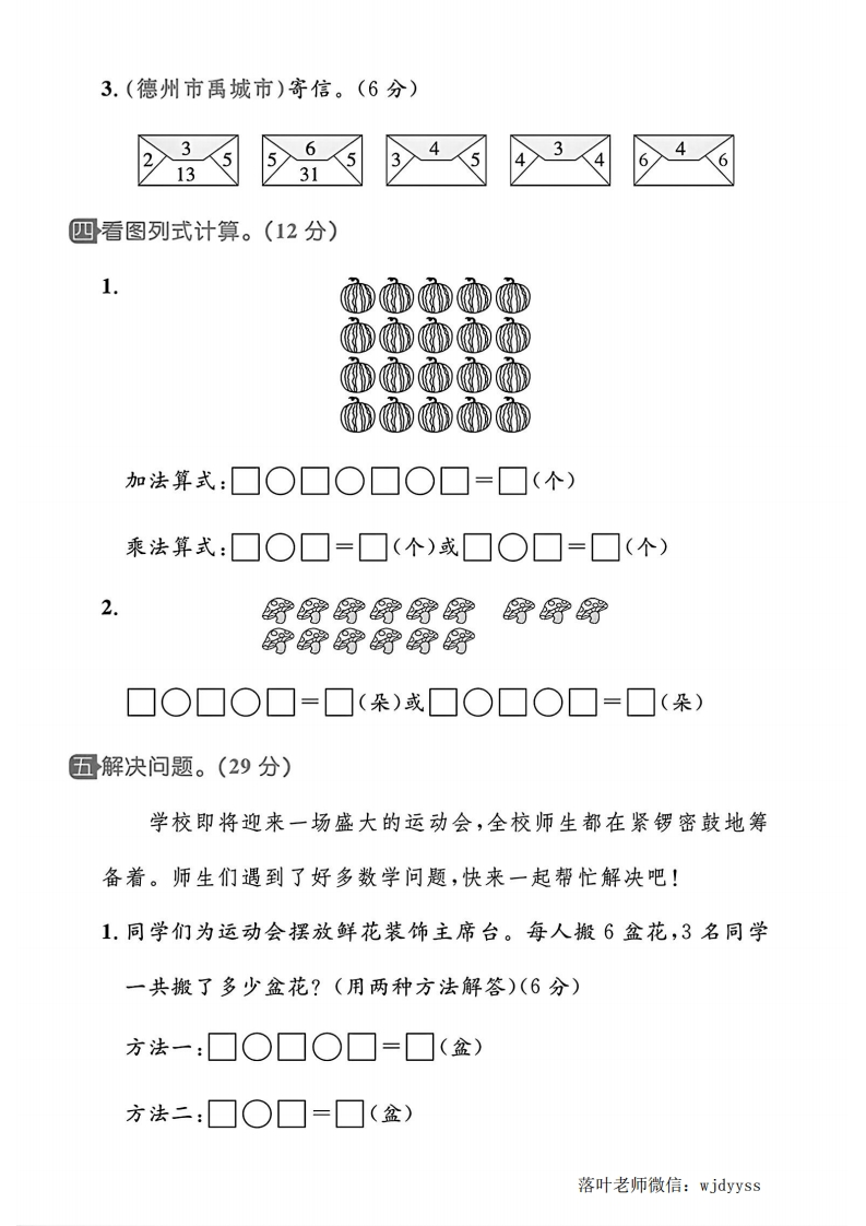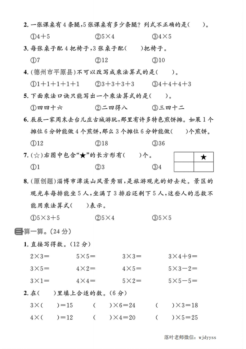 2025青岛63制二年级数学上册单元测试卷第二单元测试卷密⊙测试时间:40分钟⊙满分:100分十卷面:5分评价毁一填一填。(19分)1.5×3改写成加法算式是()或()。2.2个4相加的和是(),2个4相乘的积是(),2与4相加的和是()。3.一家5口人,吃饭时每人需要用1个碗和2根筷子,那么一共要准蜜备()根筷子。4.(跨学科)根据汉字“木”有4画,计算汉字“森”的笔画可以列乘法封算式为()。5.摆1个正方形要用()根相同的小棒,摆3个单独的正方形要用()根小棒。器6.右图中一共有()条线段。7.照样子,填一填。澳液汊汊汊汊滩8.☐×☐=16☐XO=24○×△=12线口=(O=()△=(号选一选。(16分)1.4个6相加,列式正确的是()。①4+4+4②4+6③4X6落叶老师微信:wjdyyss