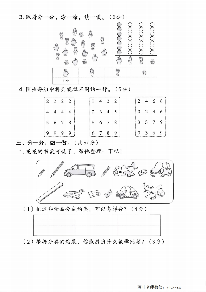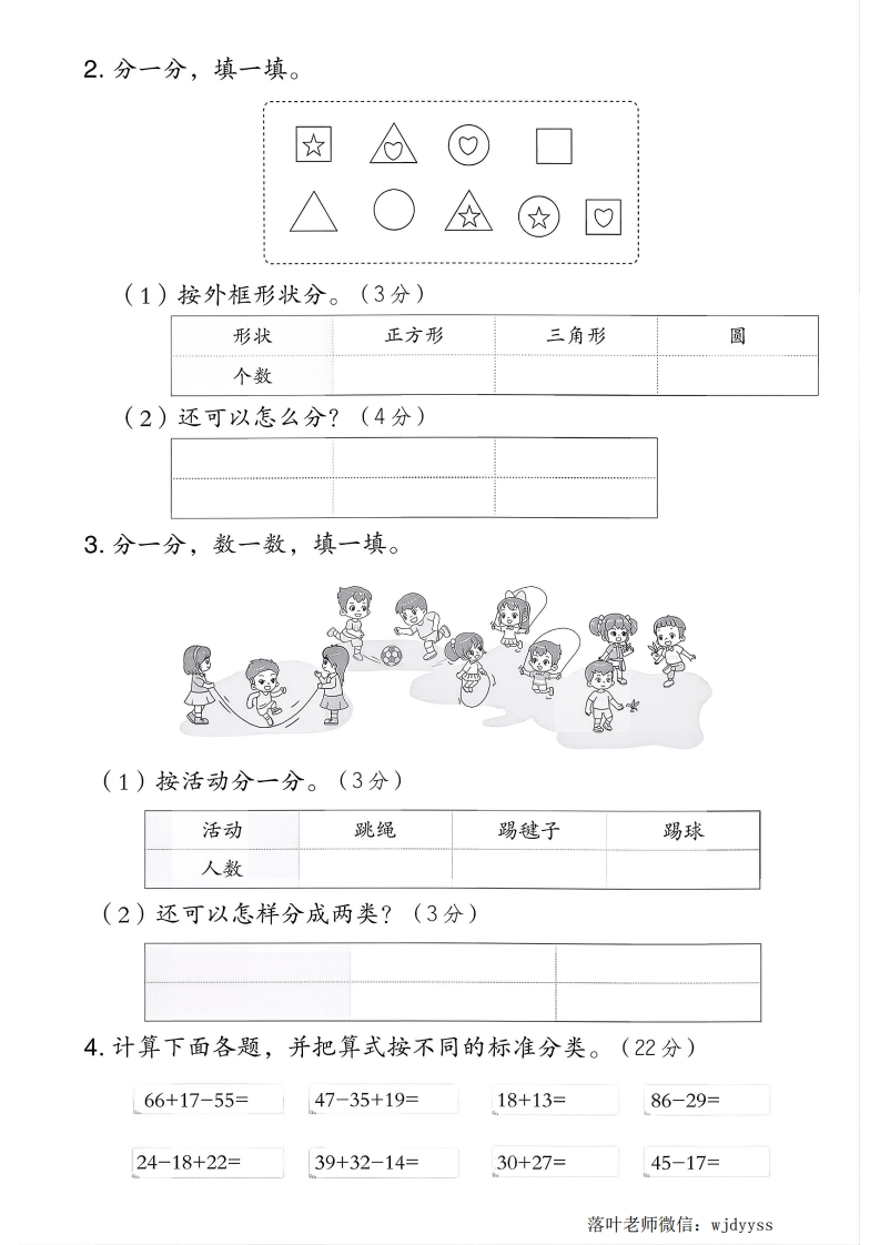 2025青岛63制二年级数学上册第一单元测试卷11时间:60分钟满分:100分一、我聪明,我会做。(第1题5分,其余每空2分,共19分)1.在水果下面画“○”邮h的Q一共有(弥)种水果。2.△ovo△☐○这是按()分类的。型000△V这是按()分类的。3.分一分。(填序号)》封①②③④⑤(1)天上飞的:地上跑的:)水里游(行)的:()(2)交通工具:(动物:()二、我机灵,我会动。(共24分)站1.把每组中同类的圈出来。(6分)线2.把每组中同类的圈出来。(6分)32+1729-1546+5233+24落叶老师微信:wjdyyss