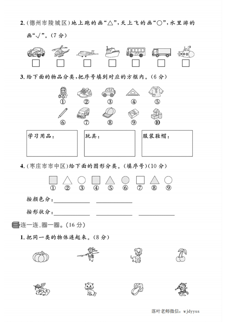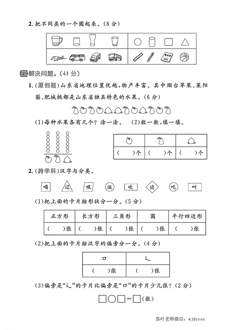 2025青岛63制二年级数学上册单元测试卷第一单元测试卷密⊙测试时间:40分钟⊙满分:100分十卷面:5分评价毁二选一选。(15分)1.下面的图形中,与其他图形不是同一类的是(③2.下面的食物中,()不是肉类。①鸡翅②牛排③米饭3.下列选项中,属于学习用品的是()。封D③4.下面与黑板同一类的是(孙①门②足球③粉笔5.0O①②③④⑤⑥给上面的物体分类,可以有()种分法。①1②2③不确定线二填一填。(28分)1.在水果下面的☐里画“/”,蔬莱下面的☐里画“○”。(5分)0口落叶老师微信:wjdyyss