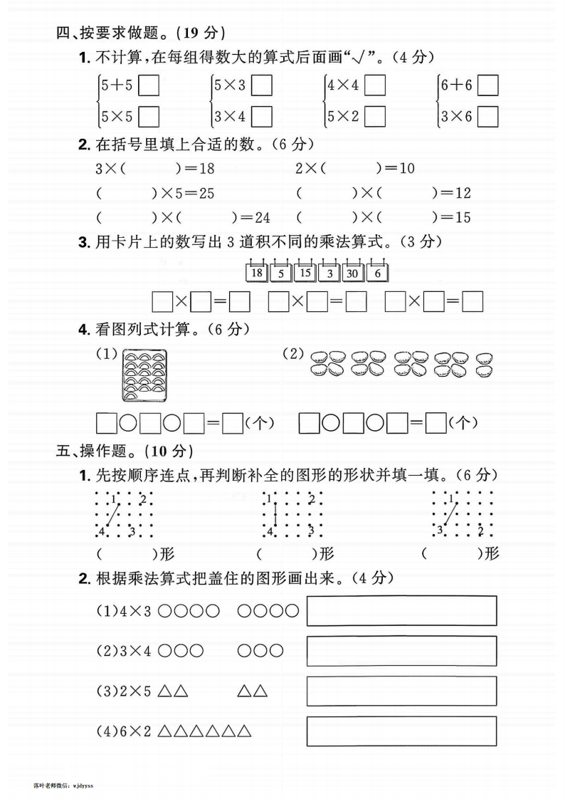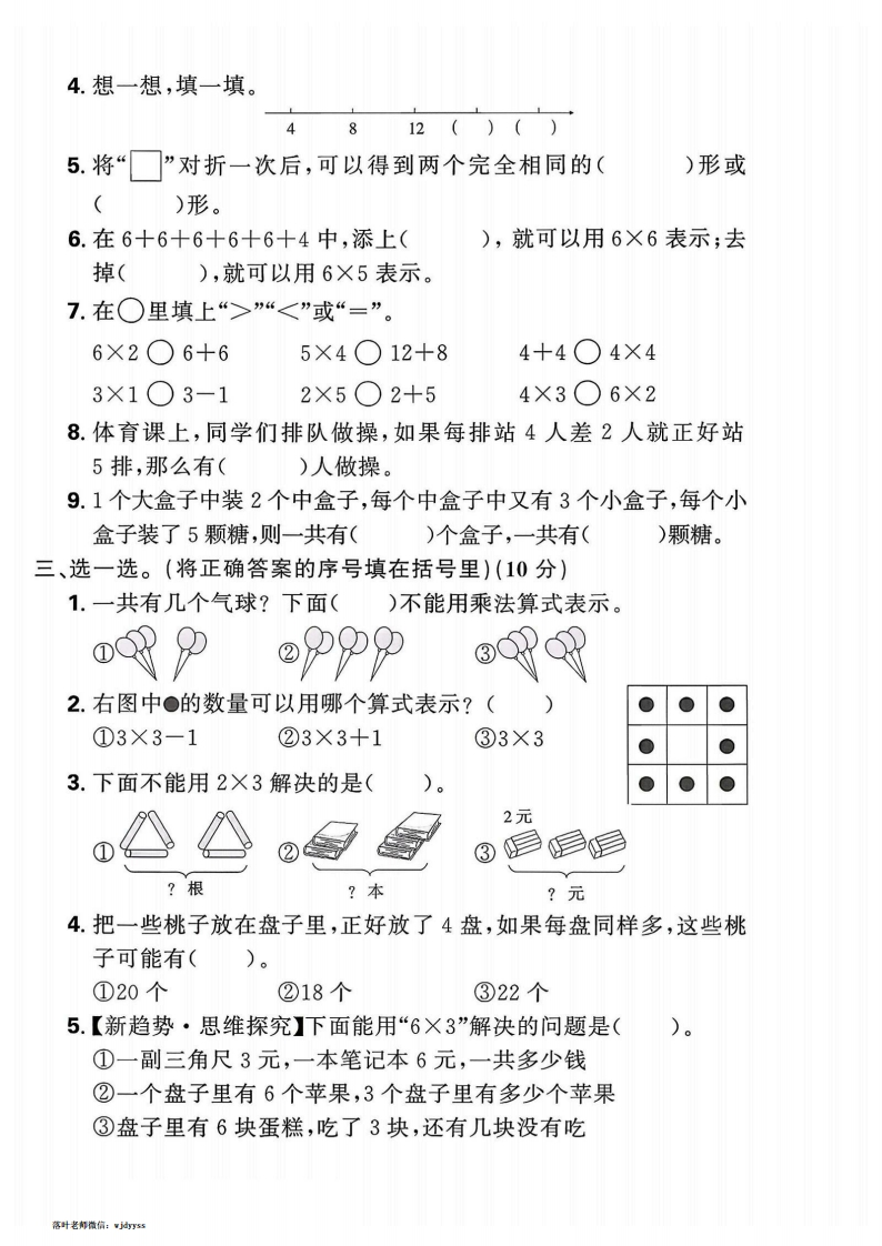2025-2026学年青岛版二年级上册数学月考真题卷第一阶段核心素养测评卷(月考一)⊙时间:40分钟满分:100分题号二三四五六七总分等级得分一、直接写出得数。(8分)】3×3=5×4=4×4+5=5×5-8=密2×2=3×6=1×4+4=6×6+5=3×4=6×2=3×3+6=4×5-3=2×5=4×4=6×5+5=3X4+8=二、填一填。(33分)封1.帮小猴数桃子。O线(1)小猴这样数:1个2,2个2,()个2,()个(2)列加法算式:();列乘法算式:()或()。2.把口诀填完整。二五()()三十)三十六()四得四()十五)二十靠3.4+4+4+4+4乘法算式5+5+5+5)个()相加)个()相加从以上算式可以看出:求几个相同加数的和,用()法计算比较简便。品落卧老南微信:j55