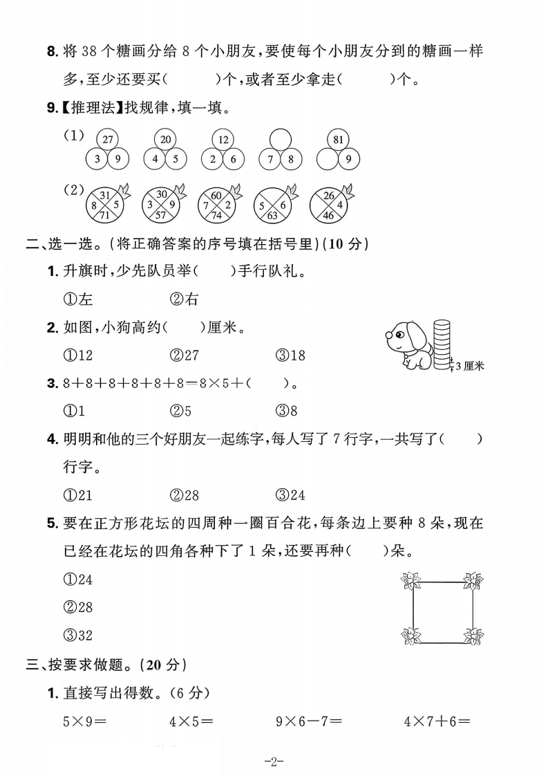 2025-2026学年青岛版二年级上册数学期中测评卷期中综合素养测评卷时间:40分钟满分:100分题号三四五总分等级得分一、细心填空。(33分)密列式为()×()=(),读作:(),其中乘数是()和(),积是()。2.1双筷子有()根,求5双筷子有多少根就是求()个封()相加的和是多少,写成乘法算式是()。3.夜晚当你背对北极星时,你的前面是(),后面是()左面是(),右面是()。线4.根据不同的乘法口决,写出两个积是12的乘法算式。()×()=12()×()=125.【新情境·传统文化】一年有春、夏、秋、冬4个季节,每个季节有6个节气,一年一共有()个节气。6.【尝试法】()里最大能填几?()×6<438X()6020>()X96×()50()×7<5041>()X77.林林看一本故事书,从第1页开始看,他每天看3页,看了4天。林林第5天应该从第()页开始看。品