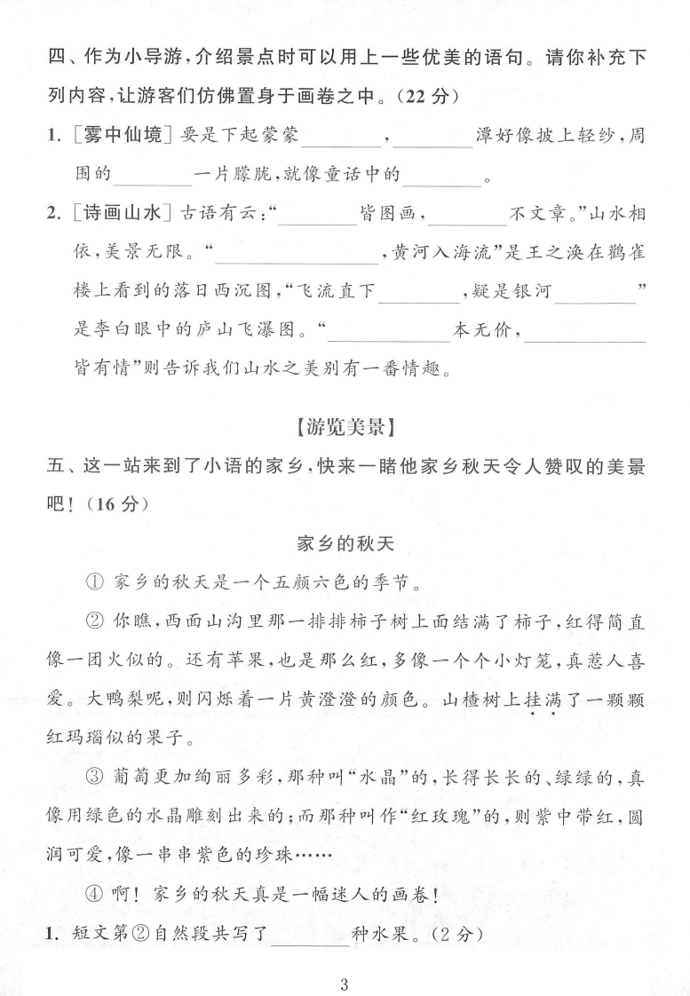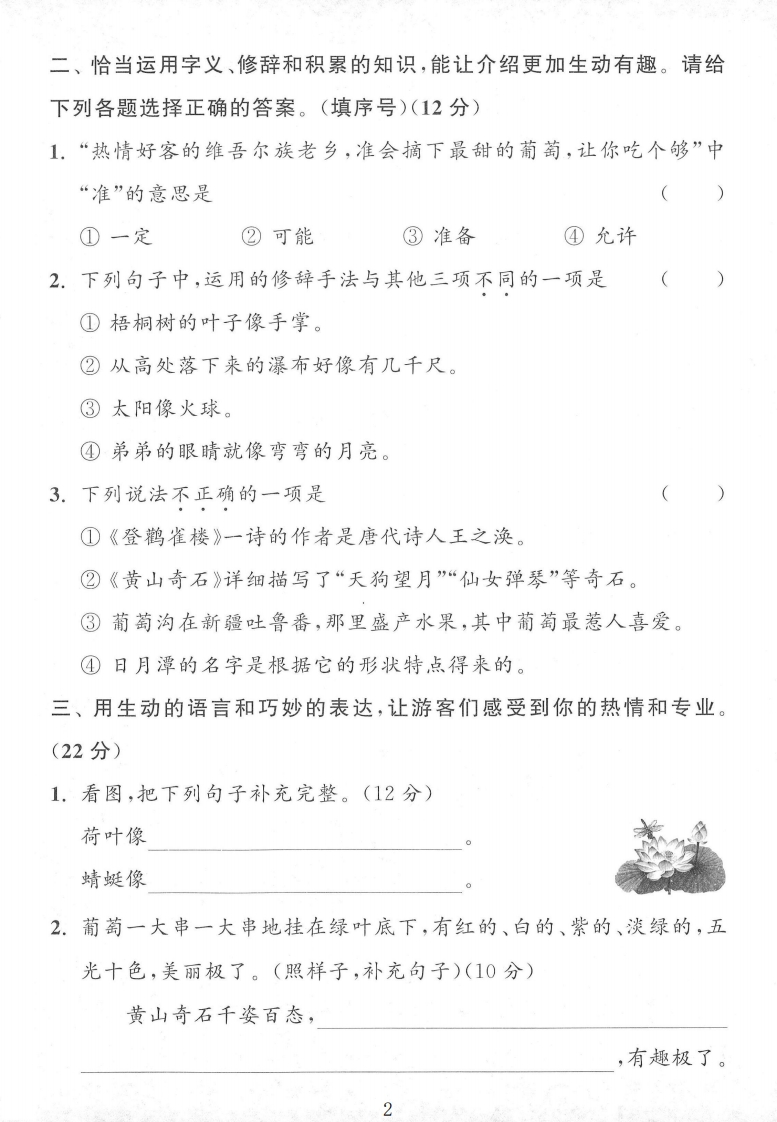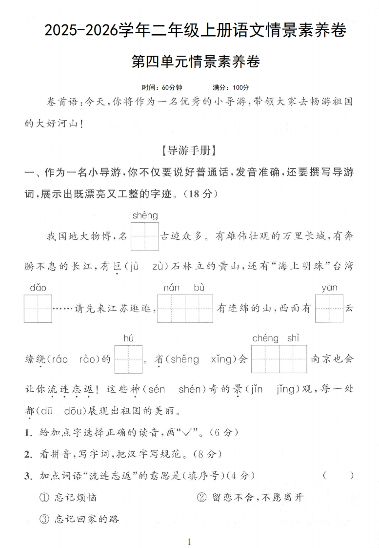 2025-2026学年二年级上册语文情景素养卷第四单元情景素养卷时间:60分钟满分:100分卷首语:今天,你将作为一名优秀的小导游,带领大家去畅游祖国的大好河山!【导游手册】一、作为一名小导游,你不仅要说好普通话,发音准确,还要撰写导游词,展示出既漂亮又工整的字迹。(18分)sheng我国地大物博,名古迹众多。有雄伟壮观的万里长城,有奔腾不息的长江,有巨(jùZù)石林立的黄山,还有“海上明珠”台湾dǎonanbuyan…请先来江苏逛逛,有连绵的山,西面有húcheng shi缭绕(ráorào)的省(shěngxing)会南京也会让你流连忘返!这些神(sénshén)奇的景(jinjing)观,每一处都(dūdou)展现出祖国的美丽。1.给加,点字选择正确的读音,画“√/”。(6分)2.看拼音,写字词,把汉字写规范。(8分)3.加,点词语“流连忘返”的意思是(填序号)(4分)()①忘记烦恼②留恋不舍,不愿离开③忘记回家的路1