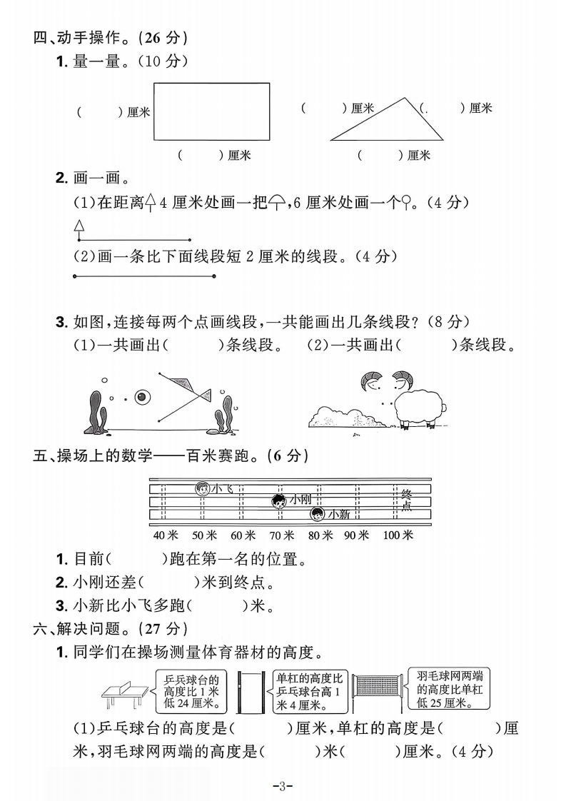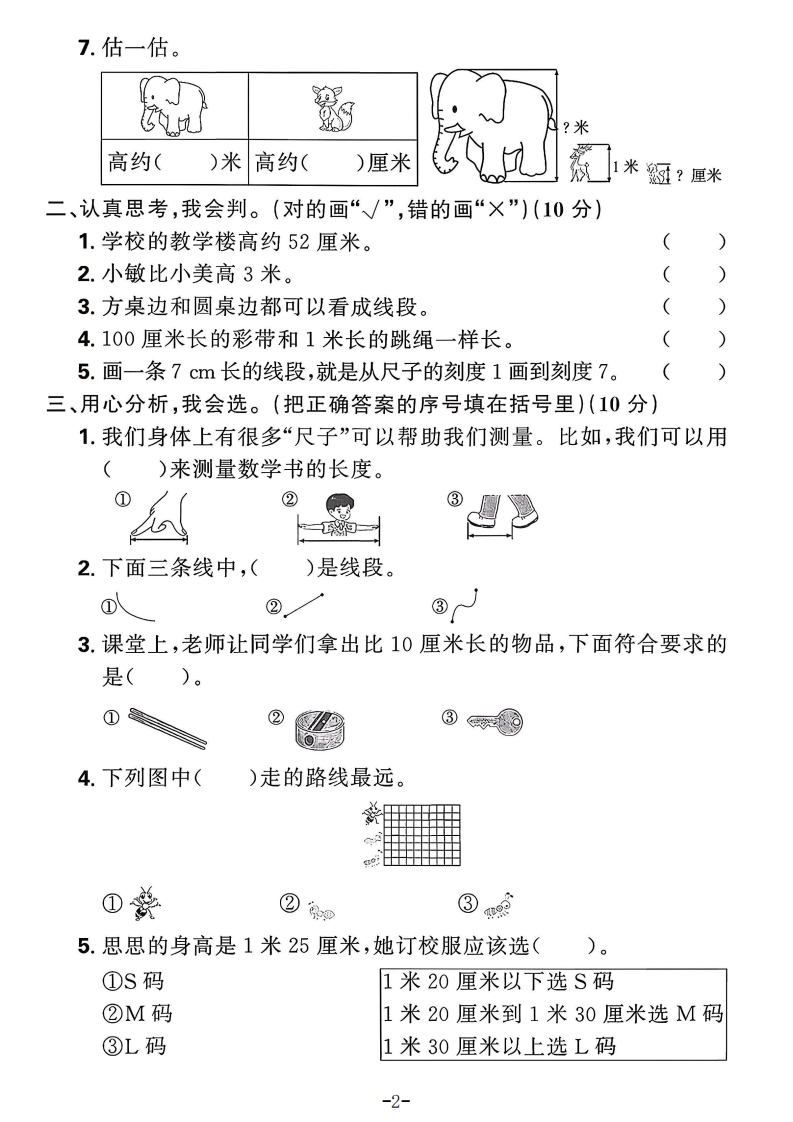 2025秋季人教版二年级上册数学单元测试卷第四单元测试卷(时间:40分钟满分:100+10分)题号四五六附加题总分等级得分露一、开动脑筋,我会填。(21分)1.校园里的长度单位。(圈一圈)我们先去教室里走走,(橡皮作业本)的厚度大约密是1厘米,(讲桌椅子)的高度大约是1米。我们再去操场上看大约用11秒跑了50(米厘米),跳了99(米封厘米)。2.a2g467。的2356780的玫瑰花长()cm银杏叶长()cm3.将三条绳子绕在三棵粗细相同的大树上。线童①②③绳子最长的是(),绳子最短的是()。(填序号)4.20米+5米=()米60厘米一20厘米=()厘米80厘米一30厘米=()厘米40厘米十60厘米=()米5.数一数,下面图形中各有几条线段?靠)条()条()条()条6.右图是妙妙一步的长度,若妙妙沿着床的长走了4步,沿着宽走了3步,则床的长约为()米,宽约为50厘米)米()厘米。品