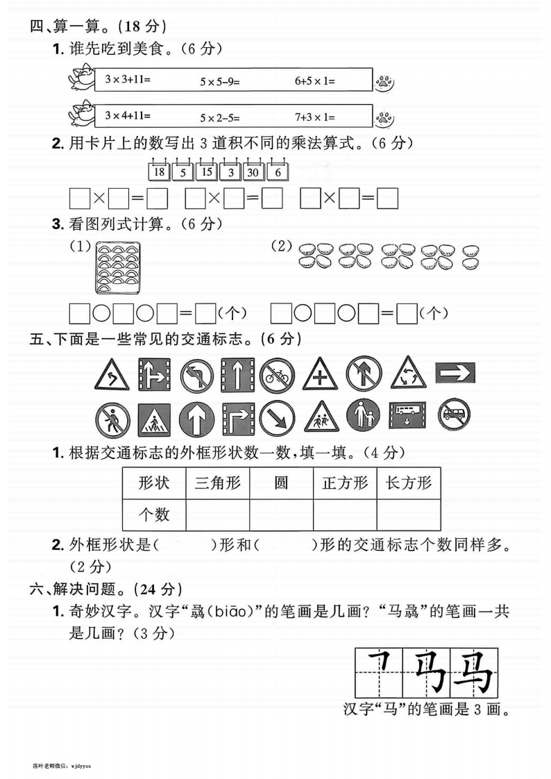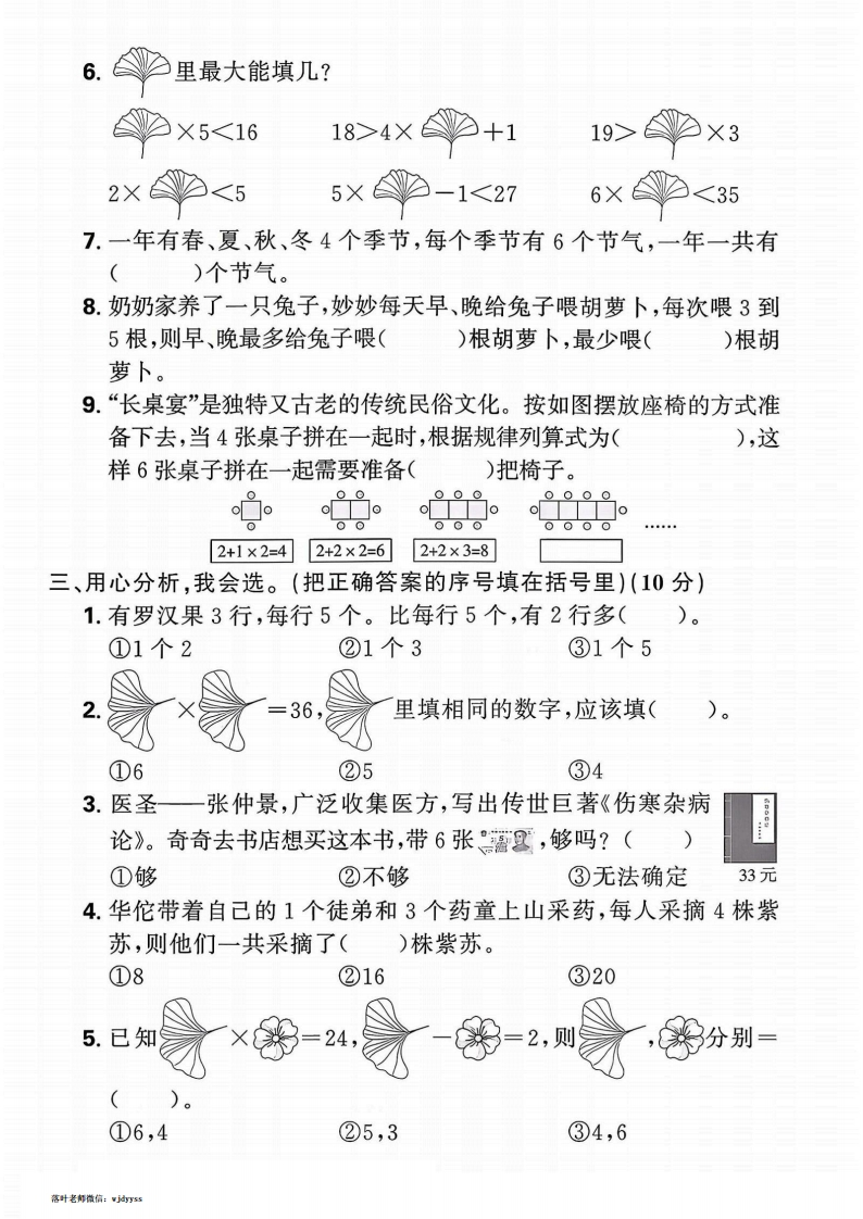 2025-2026学年人教版二年级上册数学月考真题卷第一阶段核心素养测评卷(月考一)⊙时间:60分钟满分:100分+10分题号三四五六附加题总分等级得分、直接写出得数。(8分)2X2=4×5=5+3=4×1=密6X2=3+2=4×4=3×1=5×4+13=3×4+8=4×6一7=3×5+5=5×6-6=3×3+4=5×5-14=2×4+9=二、开动脑筋,我会填。(34分)1.先把乘法口决补充完整,再根据乘法口决写出对应的乘法算式。封(4分)(1)二五((2)()得八(3)五()二十五线2.3+3+3+3=()×()2+2+2-3=()×()-(4+4+4-4=()×()5+5+5+5+2=()×()+(3.蒲公英含有丰富的维生素及矿物质,具有消炎、护肝等作用。小兔子爱吃蒲公英,请将蒲公英上所填的数补充完整,并回答问题。0小免子吃到第6朵蒲公英代表的数是(),列式是(4.在6+6+6+6+6+4中,添上(),就可以用6×6表示;去掉(),就可以用6×5表示。5.一个△有3个角,分有()个角;()个△有18个角。落叶老南微信:j55