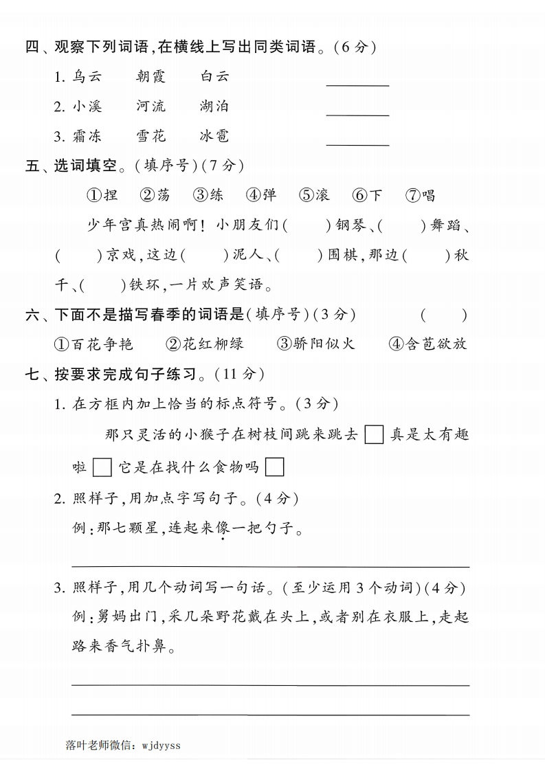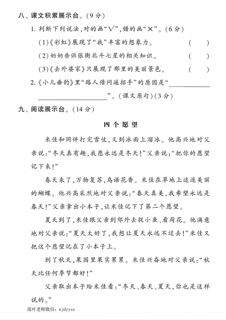 2025秋季人教版二年级上册语文单元测试卷第三单元测试卷(时间:60分钟满分:100分)题号二三四五六七八九总分得分一、用“√”给加点字选择正确的读音。(6分)》钢琴(qinqing)留下(iniu)汤勺(sá0shao)那一会儿左转(zhuanzhuan),一会儿右转(zhunzhuan),乔乔被弄得晕头转(zhuanzhuan)向。二、读下面的步骤,看拼音,写字词,完成练习。(21分)tixietu前准备好一材料:纸、颜料等。②然女gěihěn后,用颜料玩偶画五官。③放在通风处晾千měiliniyuan快,一个的玩偶就做好了。④把揉捏出脑袋和身体,用小木棍作手臂。给上面的步骤排序:。(填序号)(3分)三、同音字填空。(8分)mingizuòzhi闻()华())下一()笔文()()气)位一()鸭落叶老师微信:wjdyyss
