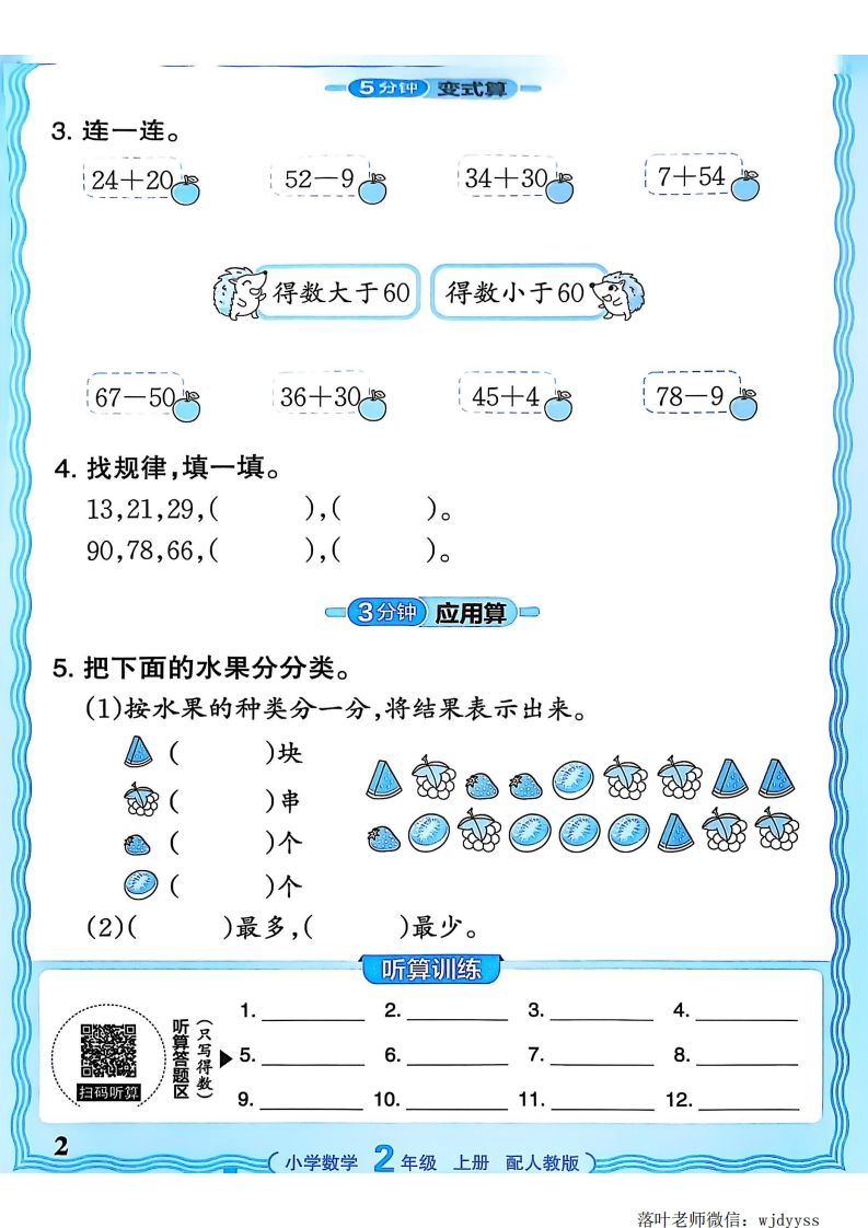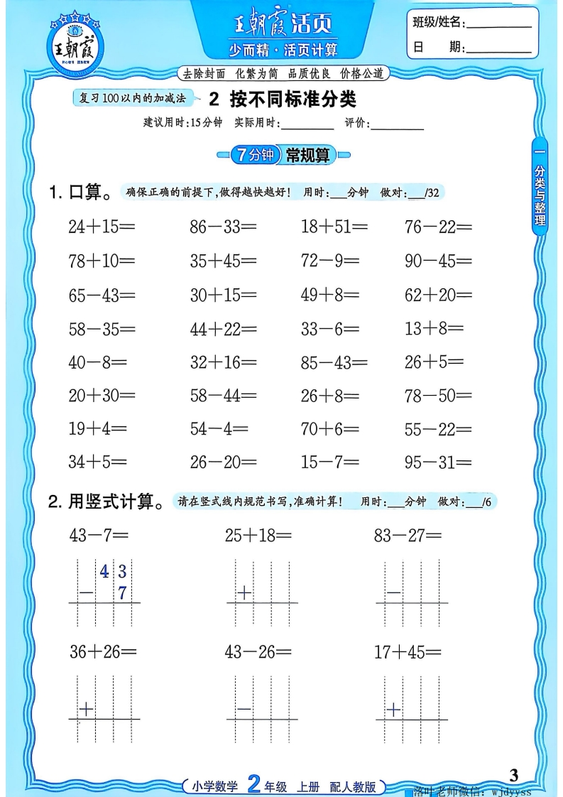 Q Nw江西人尼出版社尘雀2025秋小学数学年级上册配人教版少而精活页计算朝霞文化产品研发中分类与整理复习100以内的加减法1按给定标准分类建议用时:15分钟实际用时:评价:7分钟常规算1.口算。确保正确的前提下,做得越快越好!用时:分钟做对:/1621+40=90-7=8+64=36-15=36-10=80-20=32+7=17+81=28-7=77-40=81+10=66+22=9+58=40-8=29-3=97-55=2.用竖式计算。请在竖式线内规范书写,准确计算!用时:分钟做对:/657+8=63-9=75-36=57十846+29=38+24=60-15=1小学数学2年级上册配人教版落叶老师微信:wjdyyss