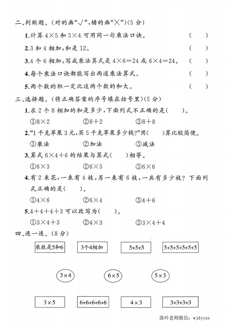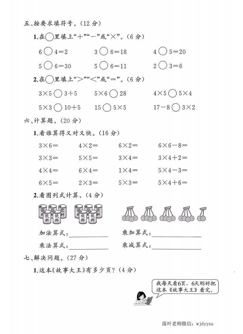 2025人教版二年级数学上册单元测试卷第二单元测试卷霸检测时间:60分钟满分:100分+10分题序三四五六七附加题总分得分一、填空题。(第1题2分,其余每空1分,共23分)弥毁封7Y7壁哩明线()个()()个()2.3个5相加的和是(),写成乘法算式是()或(内)。黛不3.4×6=(),读作()乘()等于()。4.把下面的乘法口诀补充完整。要二三()四()十六)六三十六答)四十二()十八()五二十靠5.把下面的加法算式改写成乘法算式。题5+5+5+5=(8+8+8=()2+2+2+2+2+2=(7+7+7+7+7=(6.一个乘数是6,另一个乘数是5,积是(),写成乘法算式是()☒7.买5个皮球要()元,4元5元买6根跳绳要()元。落叶老师微信:wjdyyss