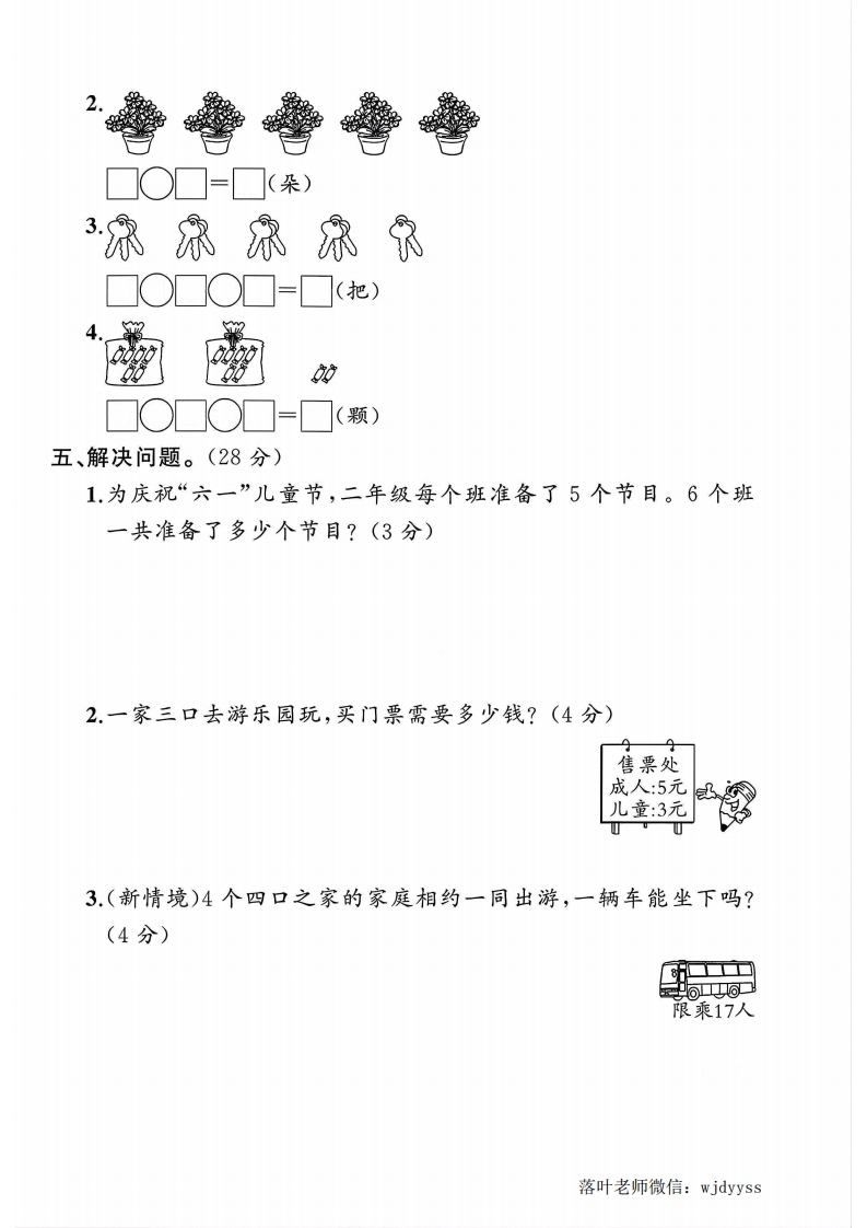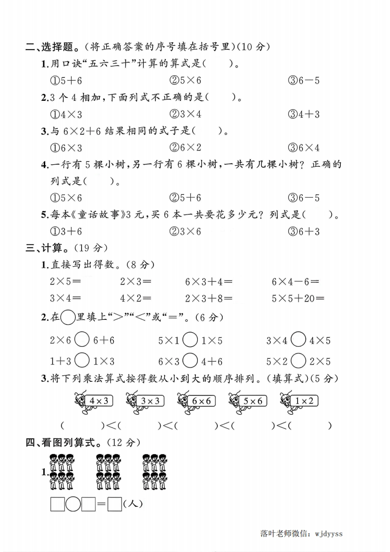 2025人教版二年级数学上册单元测试卷第二单元测试卷时间:60分钟满分:100分+10分题序三四五附加题总分鄂得分一、填空题。(第1小题4分,第5小题2分,其余每空1分,共31分)弥1.封p)个(加法算式:()线乘法算式:()或()2.把口诀补充完整。内一()得六四()二十四)十八五()二十五二六()六六()不3.一个加数是6,另一个加数是2,和是();一个乘数是6,另一个乘数是2,积是()。要4.计算5×2+8时,先算()法,再算()法,结果是()。5.改写下面的加法算式。答6+6+6+6+6+6+6=☐×☐靠13+3+3+3+3+2=☐×☐+☐题6.在里填上“十”“一”或“X”。44=162=11()1=13=725=105=06=95=67.1只小兔3瓣嘴,2只耳朵4条腿。3只小兔()瓣嘴,()只耳朵()条腿。5只小兔()瓣嘴,()只耳朵()条腿。落叶老师微信:wjdyyss