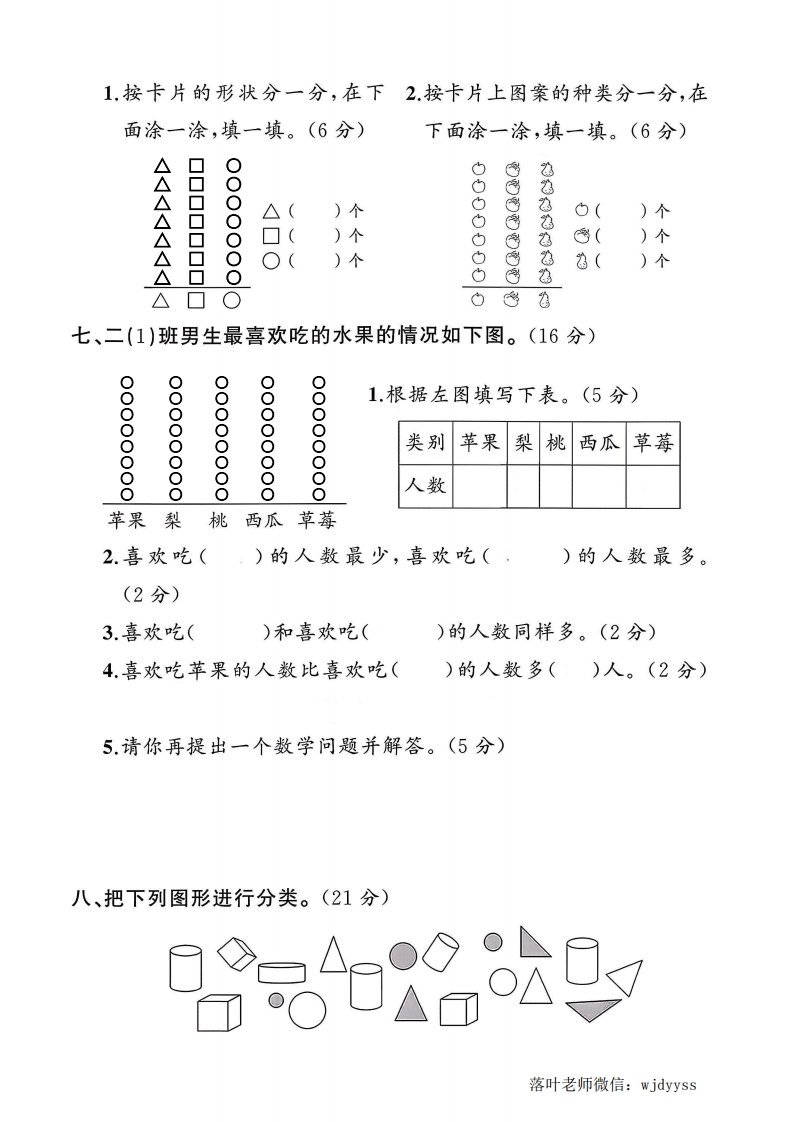 2025人教版二年级数学上册第一单元测试卷(小学教育)tangqi883天前发布关注私信19.64MB8页03012 第1页 / 共8页 第2页 / 共8页 第3页 / 共8页 试读已结束,还剩5页,您可下载完整版后进行离线阅读 2025人教版二年级数学上册第一单元测试卷(小学教育)此内容为付费资源,请付费后查看¥9.9¥19.9VIP会员免费立即购买您当前未登录!建议登陆后购买,可保存购买订单付费资源© 版权声明本站是一个信息分享及获取的平台,不确保部分用户上传资料的来源及知识产权归属,资料由老师投稿,公开渠道整理,网友上传,如果侵犯到您的权益,请联系客服删除THE END教师资料 文本预览 2025人教版二年级数学上册单元测试卷:'第一单元测试卷:时间:60分钟满分:100分+10分题序三四五六七八附加题总分鄂得分一、在水果下面画“/”,蔬菜下面画“○”。(10分)毁弥1:1封:1线:内1量二、把会飞的动物涂上颜色,把会游的动物圈起来。(5分)要三、哪个不同?把它圈出来。(8分)管③薪要作业本③④:1:1:1:1幽还.眼3落叶老师微信:wjdyyss 查看更多 收起部分 喜欢就支持一下吧点赞12 分享QQ空间微博QQ好友海报分享复制链接收藏