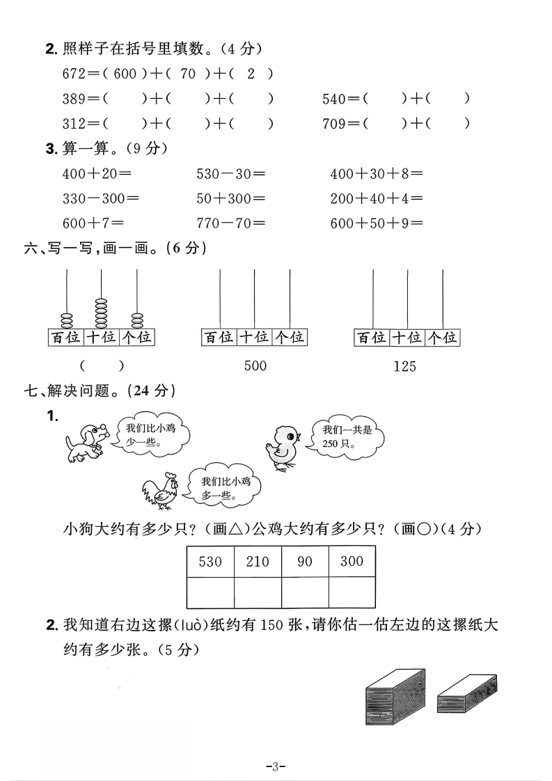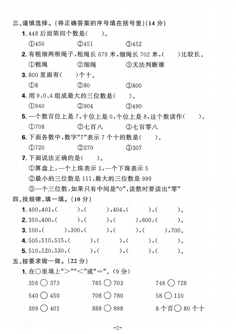 2025秋季苏教版二年级上册数学单元测试卷第四单元测试卷⊙时间:40分钟之满分:100分+10分题号二三四五六七附加题总分等级得分靴一、数一数。(4分)1.有多少块糖?2.有多少个☐?密安的明900块0明▣P的10级网爽銨)块)个封二、开动脑筋,我会填。(20分)】1.先读一读算盘上表示的数,再写一写。(最右边一档作个位)骨骨骨骨骨骨骨骨骨骨骨骨了线)()它由()个百、()个它由()个百十和()个一组成。和()个一组成。2.一个一个地数,500前面一个数是(),后面一个数是()3.百位上是3、十位上是5、个位上是0的数是()。4.900里面有()个百。783里面有()个百、()个十和()个一。荠5.一个数由9个百、6个十和2个一组成,这个数是()。6.一个三位数,百位是最大的一位数,十位是0,个位是最小的一位数,这个三位数是()。7.用0、3、8三个数字组成4个不同的三位数,并从大到小排列。()>()>()>(品-1-