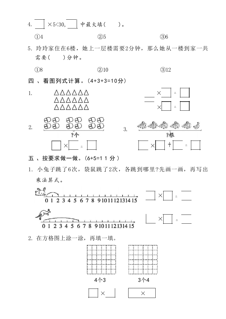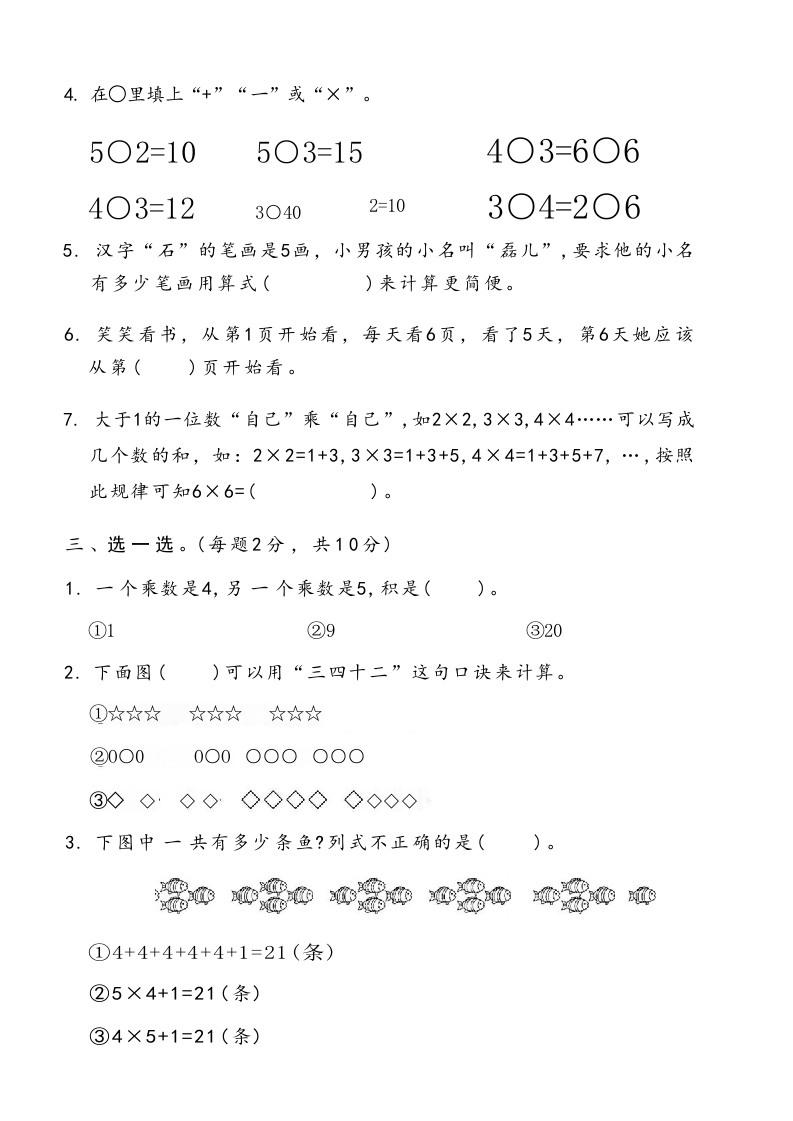 2025秋季苏教版二年级上册数学试卷第一单元达标测试卷时间:40分钟满分:100+10分题序三四五六附加题总分得分、直接写出得数。(每题1分,共12分)5×39+4=6×6=3×6+54×6=5×0=6+5=5×4-8=3×3=2×6二、填一填。(每空1分,共34分)1.根据题意写出乘法算式和对应的乘法口诀。3个5相加6+62个4相乘2个4相加2.在○里填上“>”“<”或“=”。4×5○5×42×4○2+42×6○3×46×3○4×44×3○25-96×4+6○5×63.在()里填上合适的数。)×3=185×()=206+6=()×()6×()=2436=()×62+2+2+4()×()