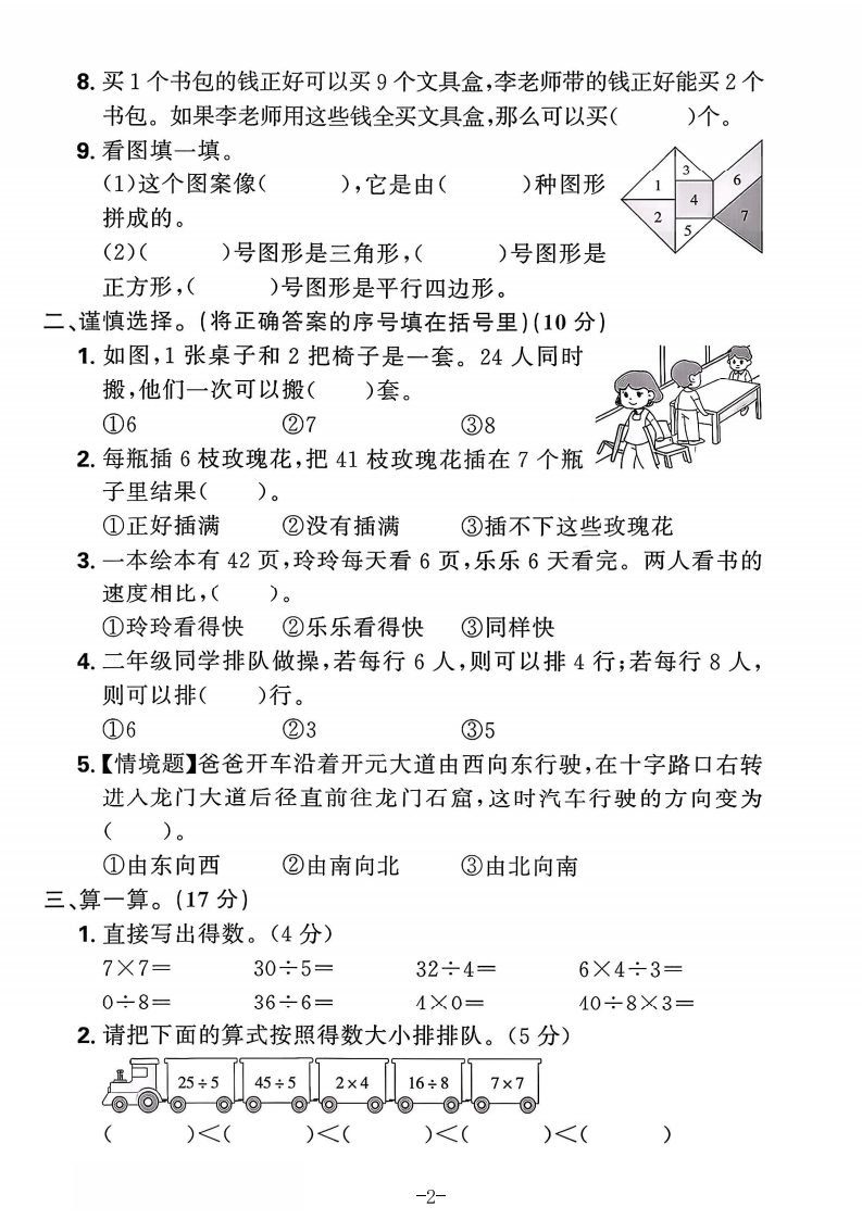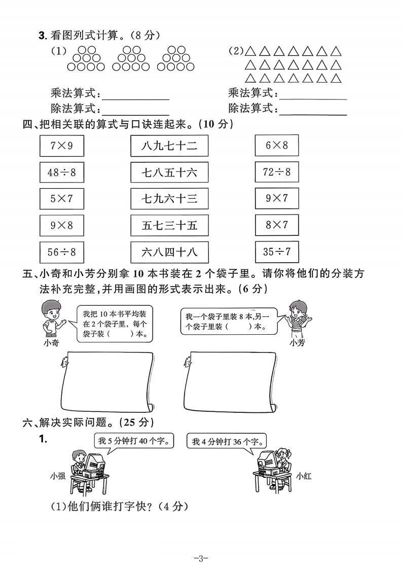 2025-2026学年苏教版二年级上册数学期中测评卷期中综合素养测评卷时间:40分钟满分:100分+10分题号二三四五六附加题总分等级得分孙一、开动脑筋,我会填。(32分)1.密一共有()个可以平均分成()份,每份是()个,算式是();还可以平均分成()份,每份毁是()个。封2.3×6=18,读作:(),算式中的“3”和“6”是(“18”是()3.补全算式并写出相应的乘法口决。6×2=()56÷7=(45÷()=(线4.除数和被除数都是9,那么商是();两个乘数都是9,那么积是()。5.根据“七九六十三”这句乘法口诀,可以写出两道乘法算式:()和(),还可以写出两道除法算式:()和()。6.在8÷8、16÷4、4十4、8÷1中,可以用同一句乘法口决算出结果的是()和()。7.妈妈花32元买了4盒牡丹饼(如下图),每盒牡丹饼()元,每个牡丹饼()元。品
