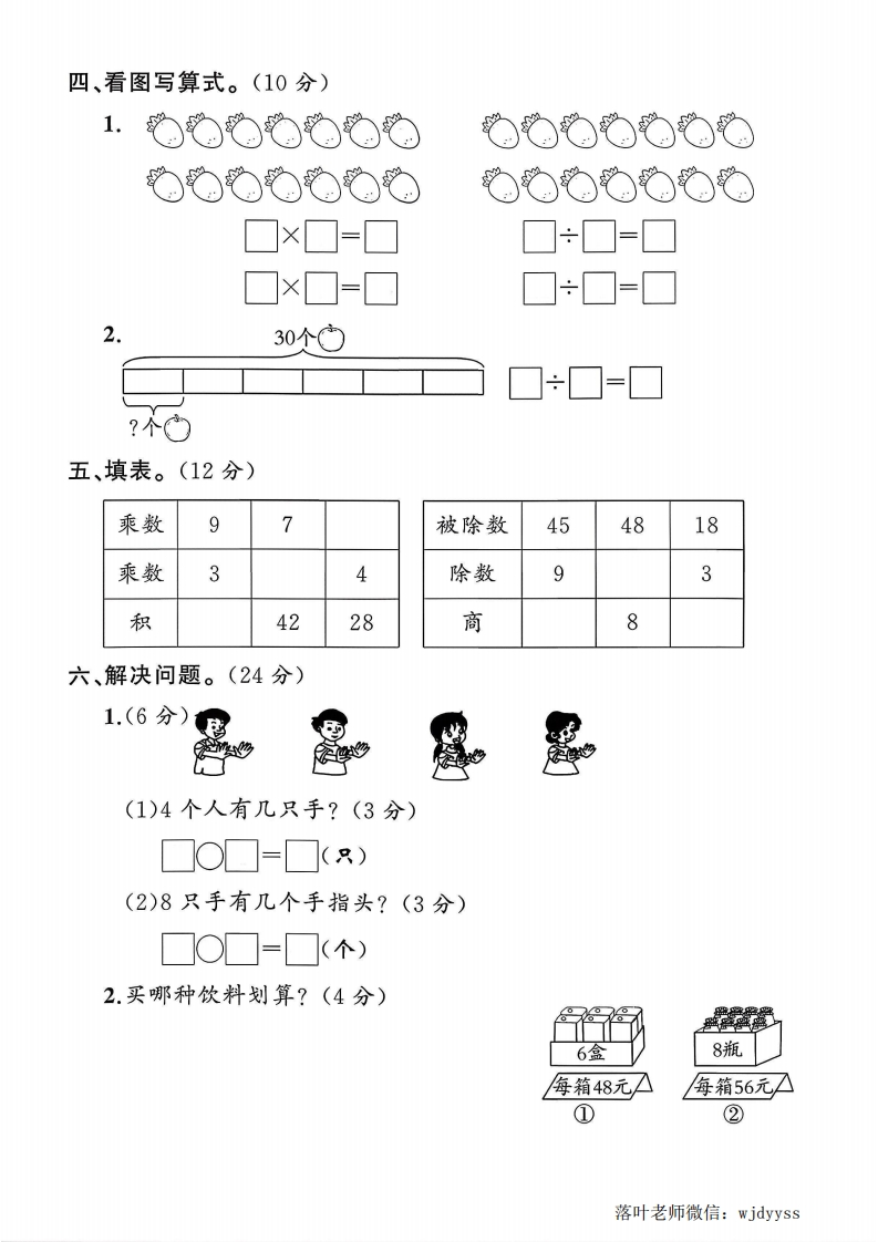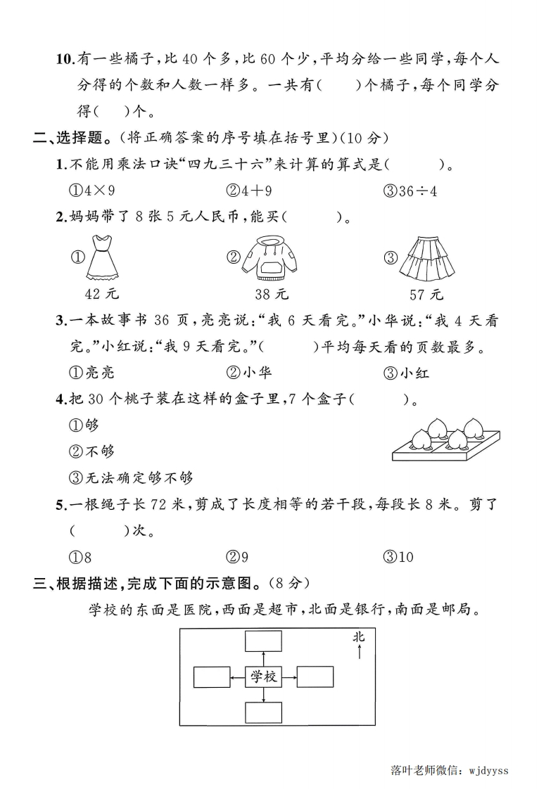 2025苏教版二年级数学上册单元测试卷第三单元测试卷器检测时间:60分钟满分:100分+10分题序二三四五六附加题总分得分一、填空题。(36分)弥1.把下列口诀补充完整。()四十九八九(七()五十六毁封)九二十七八()六十四五()四十五2.两个乘数都是7,积是();6个星期总共有()天。线3.28除以7,列式是(),商是(),用到的口诀是()。内4.在○里填“>”“<”或“=”。不5×9○35+88×8○8÷854÷9○7÷132÷4○42÷740-5○40÷81×6○36÷6要5.5个8比6个8少(),比4个8多()。6.在()里填合适的数。答5×()=40()X7=3564÷()=8()÷4=89×()=27()÷8=67.在○里填“十”“一”“X”或“÷”。8○4=1220○5=418○2=942○7=67○9=6336○6=68.讲台上有一些练习本,练习本的本数比6个7的和多,比7个7☒的和少。这些练习本最少有()本,最多有()本。9.乐乐做一道乘法题目时,把其中一个乘数6看成了4,得出积是但28。那么正确的积是()。落叶老师微信:wjdyyss