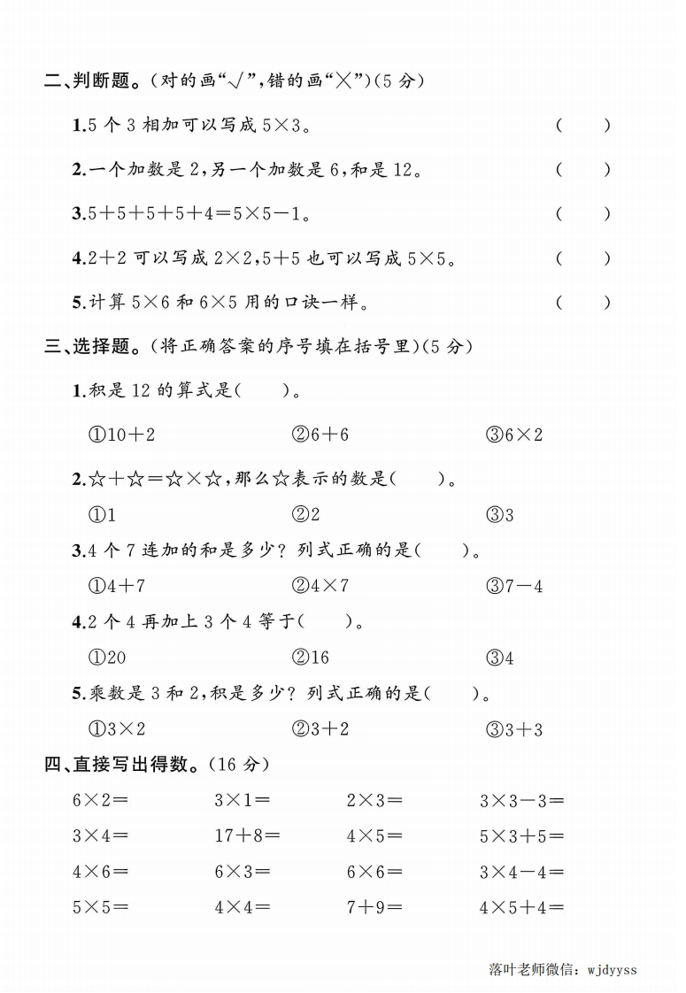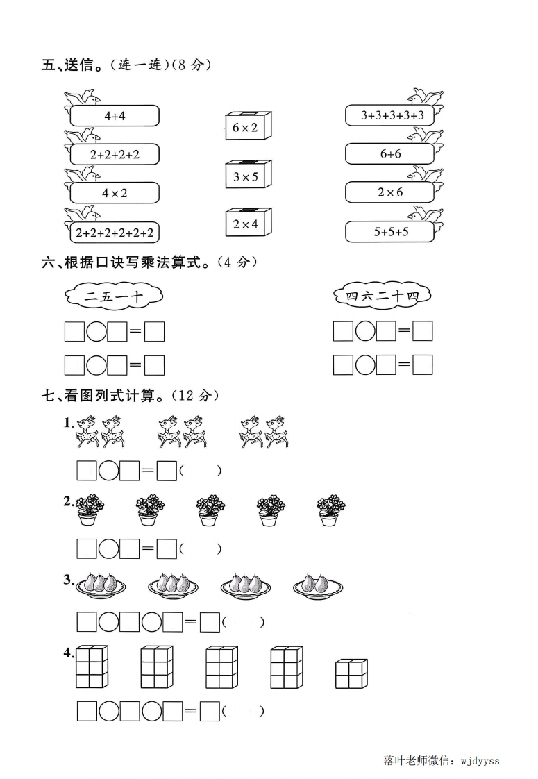 2025苏教版二年级数学上册单元测试卷第一单元测试卷时间:60分钟满分:100分+10分题序三四五六七八附加题总分p得分一、填空题。(第5小题2分,第8小题3分,其余每空1分,共26分)弥1.5×6读作();四乘三写作()。2.6个3相加,写成加法算式是(),写成封乘法算式是()或()。数3.两个乘数都是4,积是();两个加数都是4,和是()。线4.5个4相加,可以写成算式();5和4相加,可以写成算式()。内5.改写下面的加法算式。(2分)4+4+4=()×()不6+6+6+6+3=()X()+()6.把口诀补充完整。要三()十五()三十六五六(7.在括号里填上合适的数。繁()×3=182X()=83X()=158.在○里填上“十”“-”或“X”。(3分)题3○2=10○44○4=8○2○3=139.从2、3、4、6、12中每次选3个数,写出两道不同的乘法算式:()、()。10.找规律填数。(1)0,4,8,(),(),20。(2)3,6,9,(),15,()。落叶老师微信:wjdyyss