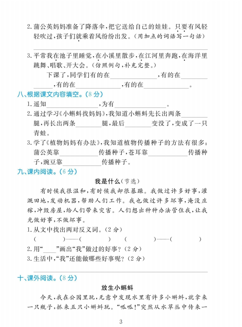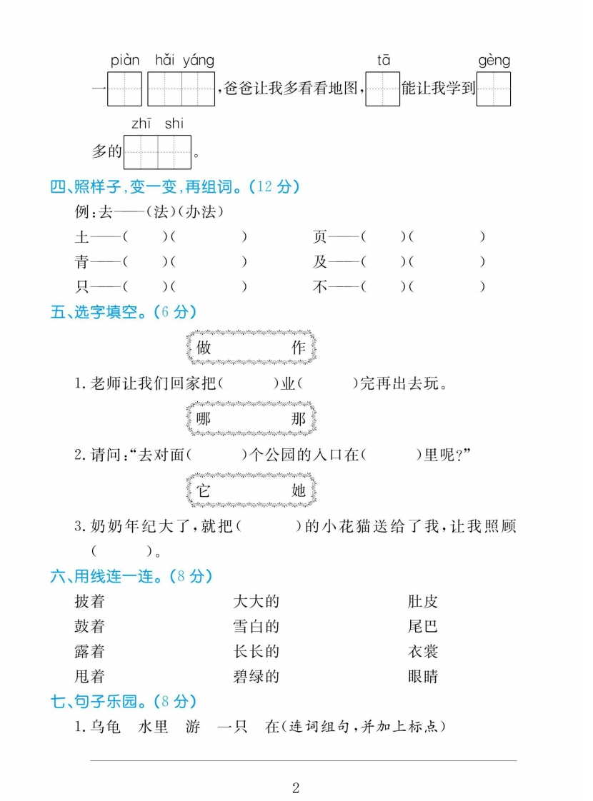 2025二年级上册语文第一单元测试卷第一单元测试卷时间:60分钟满分:100分题号三四五六七八九十一总分逊得分用线连一连。(5分)塘鼓越猜旅ei救caiyuetanggǔ二、给多音字选择正确的读音,用“/”标出。(10分)1.爷爷长(zhǎngchang)着长(zhangchang)长的胡子。2.大水淹没(mòméi)了这条小路,人们没(mòmi)有办法通过了。解3.要想获得(děid)知识,就得(děidé)好好学习。带4.为(wei wei)了让教室更亮一些,老师认为(weiwèi)我们最阳好把玻璃擦一擦。5.老师正在教(jiāojiào)室里教(jiaojiào)我们唱歌。三、读拼音,写字词。(14分)bangwanhaizitiàopi轻两个在操场上筋。dai2.爸爸给我回一张地图,打开后,爸爸说,蓝色的部分是1