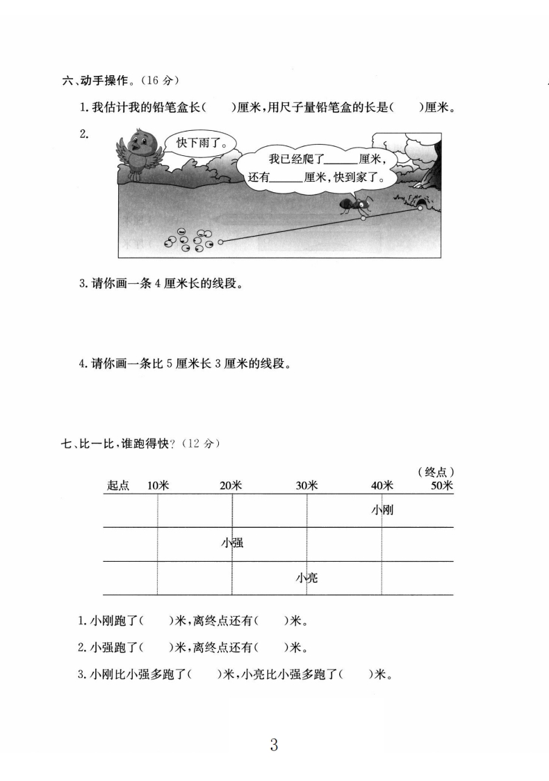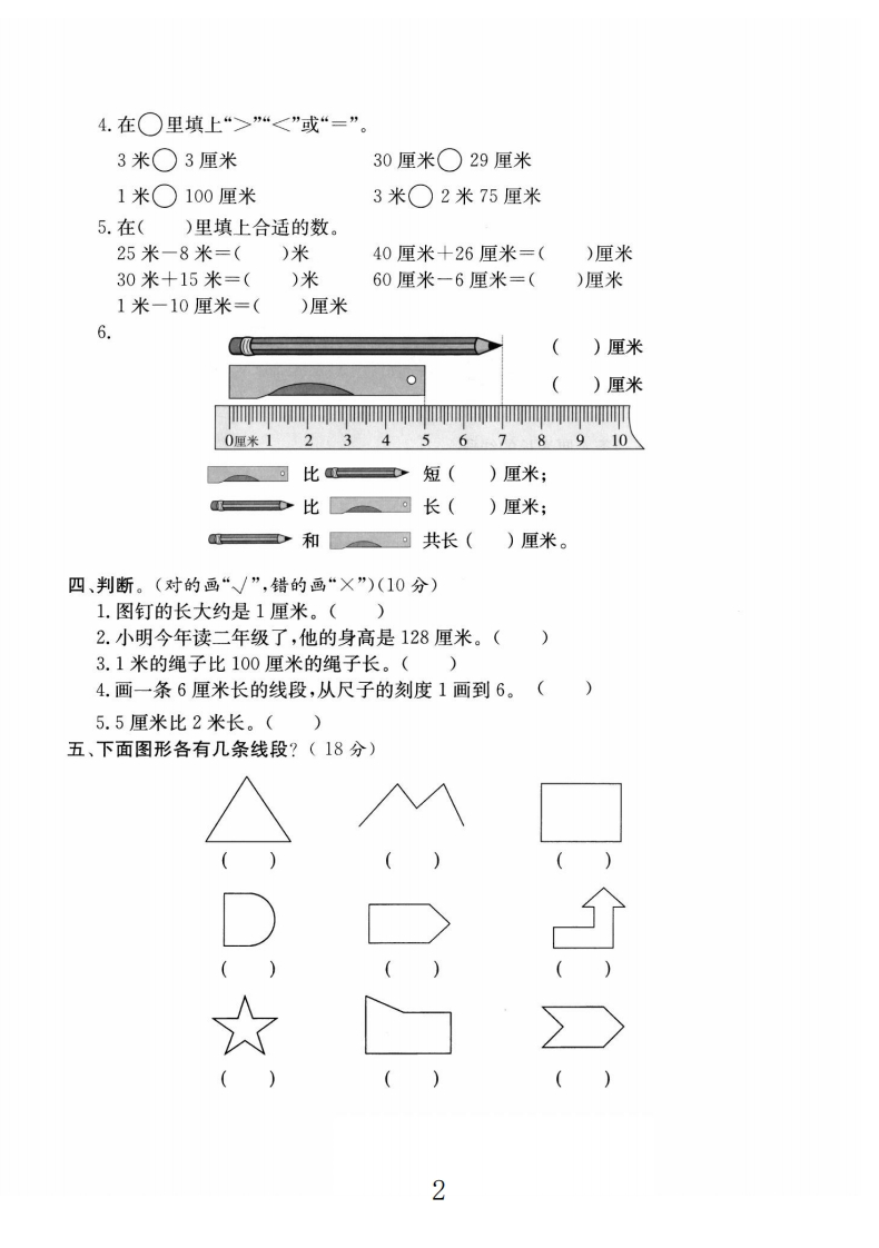 2025二年级上册数学第一单元测试卷第一单元测试卷时间:90分钟满分:100+10分题号三四五六七八总分附加题等级都得分如一、在()里填上适当的单位。(4分)拟树高约10()小明身高130()一块橡皮长约4(课桌高约1()二、下面图形哪些是线段,是的在()里画“√”,不是的画“×”。(8分)输封三、填一填。(23分)1.1米=()厘米300厘米=()米2.量比较长的物体,可以用()作单位,量比较短的物体,可以用()作并期单位。3.在下面的()里填上合适的单位。高40()厚约3(高1()22(高70(1
