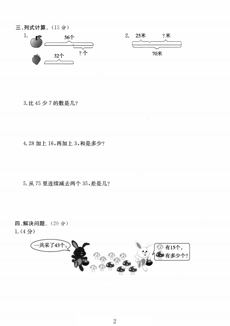 2025二年级上册数学第二单元测试卷第二单元测试卷时间:60分钟满分:100+10分题号二三四总分附加题等级都得分一、填一填。(20分)戡1.一个两位数,个位上是6、十位上是9,这个数写作(2.笔算两位数加法,要记住三条:①相同数位();②从()加起;③个位满十向()进1。3.一个数是50,另一个数是15,这两个数的和是(),差是()4.小丽家有公鸡15只,母鸡比公鸡多23只,母鸡有()只,公鸡和母鸡一共有()只。5.买一台计算器要29元,一个地球仪12元,买这两样东西一共要()元如果有50元,还剩()元。微瓶二、计算。(36分)1.口算。(10分)16+8=9+25=31-6=50+8=54-3=40+50=6+30=6+24=52-7=8+32=28+10=30-7=18+3=76-20=64-9=26+20=68-8=76-8=65+5=90-80=2.竖式计算。(8分)42864638+35-54-18+42赵北細3.列竖式计算。(18分)35+17+16=80-41-25=67-23+37=48+20-50=85-70+16=60-13-27=个y