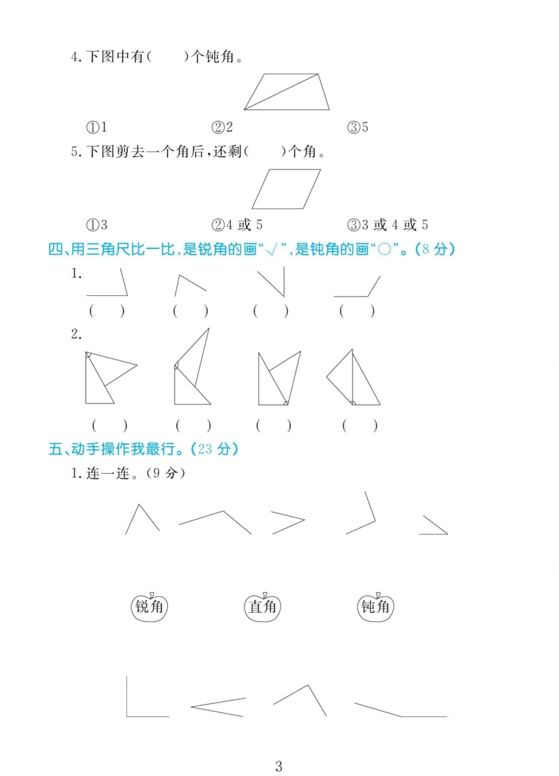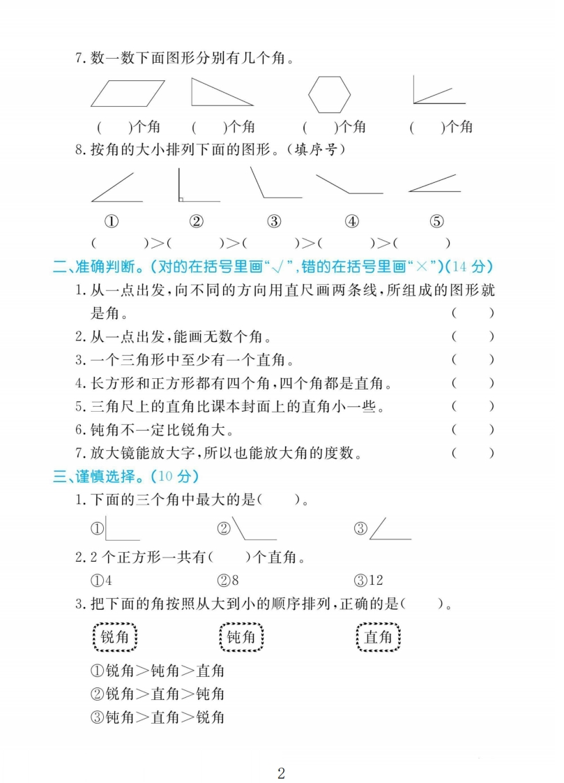 提取自黄冈名卷二年级上册数学人教版tangqi883天前发布关注私信1.53MB5页04015 第1页 / 共5页 第2页 / 共5页 第3页 / 共5页 试读已结束,还剩2页,您可下载完整版后进行离线阅读 提取自黄冈名卷二年级上册数学人教版此内容为付费资源,请付费后查看¥9.9¥19.9VIP会员免费立即购买您当前未登录!建议登陆后购买,可保存购买订单付费资源© 版权声明本站是一个信息分享及获取的平台,不确保部分用户上传资料的来源及知识产权归属,资料由老师投稿,公开渠道整理,网友上传,如果侵犯到您的权益,请联系客服删除THE END教师资料 文本预览 2025二年级上册数学第三单元测试卷第三单元测试卷时间:40分钟满分:100分题号二四五六附加题总分孙得分一、仔细填空。(27分)1.写出下面角的各部分名称。证2.按要求把序号填在括号里。拟杯②杀⑥⑦⑧⑨10不是角的有();是角的有();直角细有();锐角有();钝角有(13上有()个角,()个直角。4.比较角的大小。孙5.判断一个角是不是直角,可以用三角尺上的()比一比。6.用直角和锐角拼出的角是()角。1 查看更多 收起部分 喜欢就支持一下吧点赞15 分享QQ空间微博QQ好友海报分享复制链接收藏
