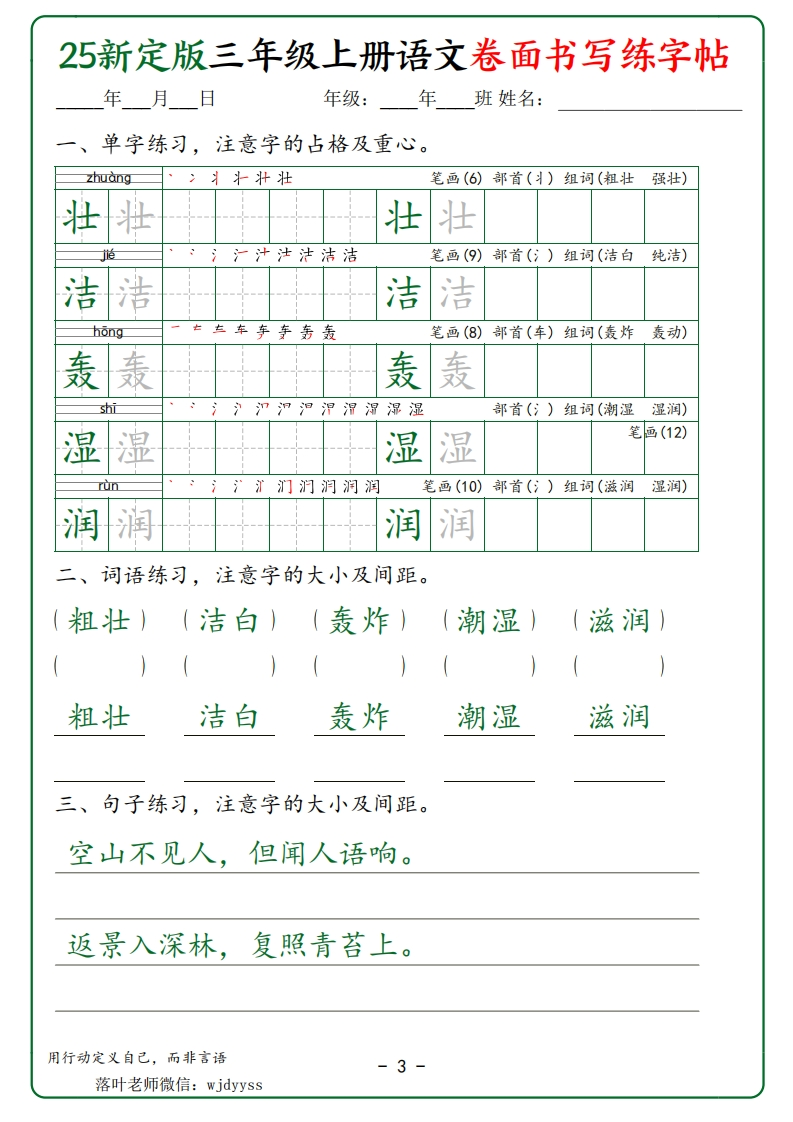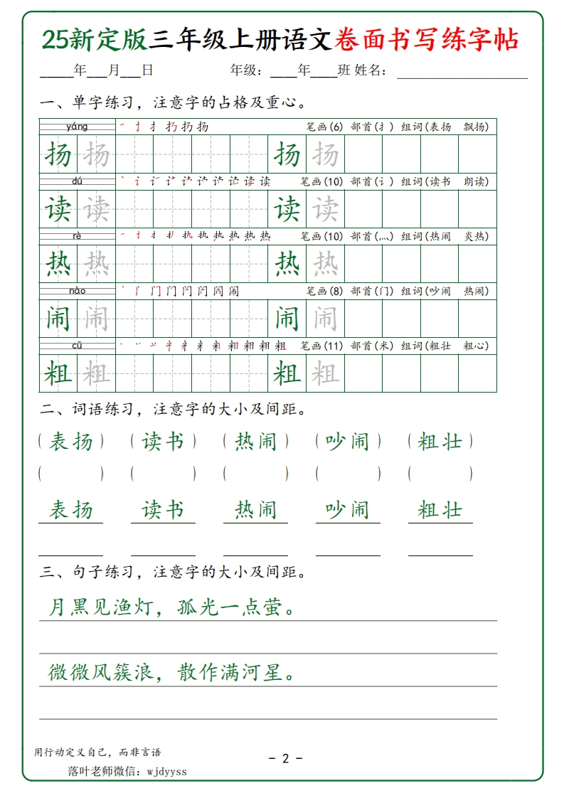25新定版三年级上册语文卷面书写练字帖年月日年级:年班姓名:一、单字练习,注意字的占格及重心。p圹圹坊坡笔画(8)部首(土)组词(山坡斜坡)坡坡坡坡q的玎纣琦球球球笔画(11)部首(王)组词(足球地球)球球球球z0于扌打扣邦招招笔画(8)部首()组词(招呼招手)招招招招吆呼笔画(8)部首(口)组词(呼叫招呼)呼呼呼呼p板o肌飘飘部首(风)组词(飘扬飘雪)飘飘飘飘笔画(15)二、词语练习,注意字的大小及间距。(山坡)(足球)(招呼)(呼叫)(飘扬)山坡足球招呼呼叫飘扬三、句子练习,注意字的大小及间距。牧童骑黄牛,歌声振林樾。意欲捕鸣蝉,忽然闭口立。用行动定义自己,而非言语1落叶老师微信:wjdyyss
