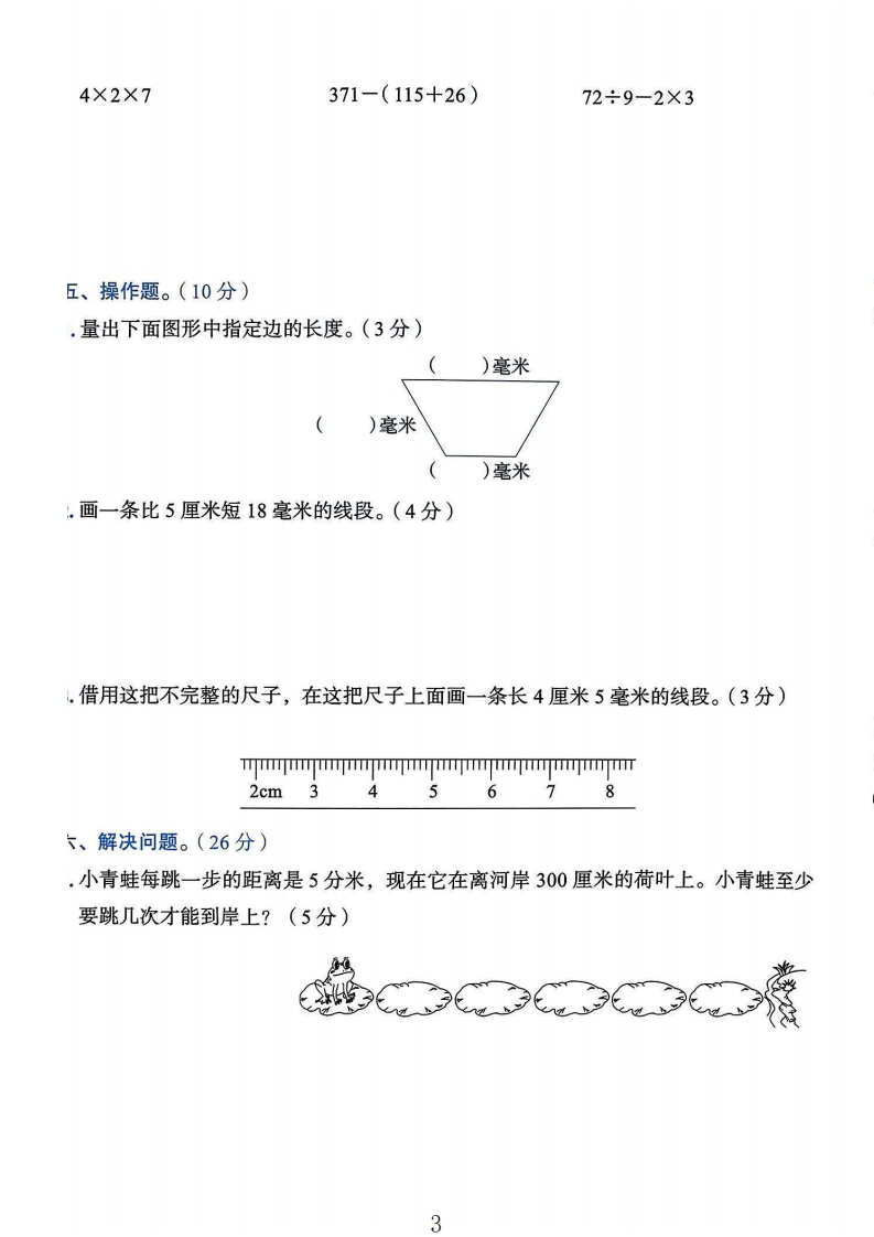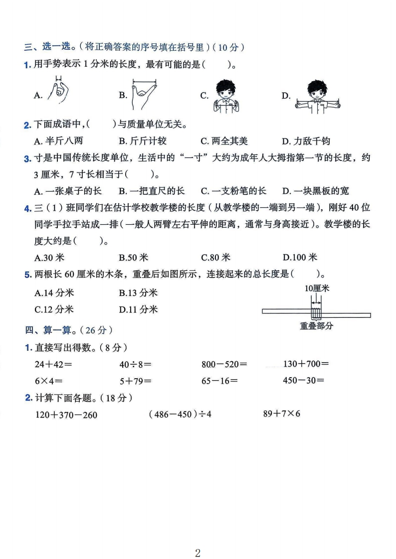 2025三年级上册数学第三单元测试卷时间:60分钟满分:100分、填一填。(每空1分,共23分)李白乘船经过长江三峡时留下了千古名句“两岸猿声啼不住,轻舟已过万重山。”测量长江的长度用()作单位比较合适,测量山的高度用()作单位比较合适。1cm28910)厘米()毫米)千克在()里填上合适的单位。(1)珠海公交集团发行了新版日月贝公交卡,这张公交卡的厚度约是1()0(2)一辆货车每小时行驶60(),可载货5()30厘米=()分米4千米=()米9米=()厘米1吨一200千克=()千克8厘米+8米=()厘米在(○里填上“>”“<”或“=”。)分米(○1米700毫米(○8分米1米-3厘米(○7分米4分米(○4厘米5千米(○4000米300克+700克(○1千克,一根铁丝第一次用去32厘米,第二次用去48厘米,两次一共用去()厘米,合()分米。,一根长16厘米的绳子,对折后再对折,每段绳子长()厘米。小区里有一条长50米的小路,李爷爷每天在小路上慢步走,如果要走1千米,需要走()个来回。:、辨一辨。(对的画“√”,错的画“×”)(5分).爸爸身高180毫米。(,走100米大约要走200步,照这样计算,800步大约能走400米。(,读秤时,指针指着几,就表示所称的物体有几克或几千克。(,看书时,眼睛离书本的距离约30毫米比较合适。(,文文2小时行了30千米,她选择的出行方式是步行。(1