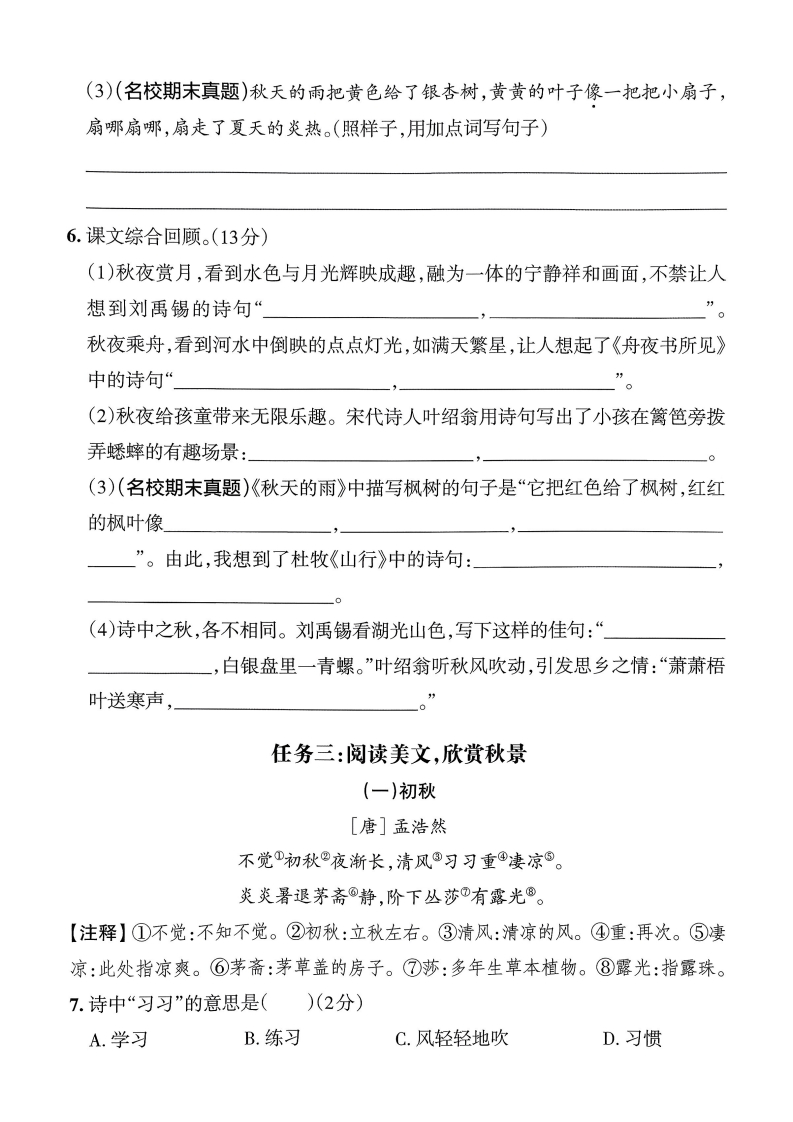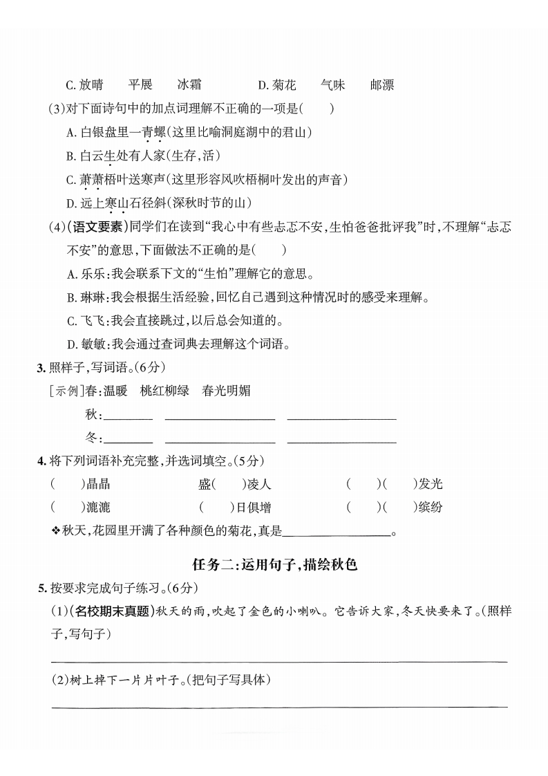 2025-2026学年三年级上册语文情境素养卷第二单元情境素养卷时间:90分钟满分:100分秋天是个丰收的季节,让我们一起去感受金秋的阳光,收获丰硕的果实。弥任务一:积累字词,寻觅秋果1.读句子,根据拼音写字词。(10分)ming langfeng shou秋天多么可爱!的蓝天下,一片景象。山野里,pailie金黄的柿子、紫红的葡萄、火红的高粱、整齐的玉米引人注目。liangshuangshenluòyegurZé的秋风吹过,树林不地铺在lingluantuan地上,有些形成了各种各样的这是秋天送给大地yinpinpin的花地毯,引得动物们出来欣赏。2.选一选。(8分)(1)下列加点字的读音完全正确的一项是(线A.抖动(dǒu)磨坊(mò)辽阔(Iiáo)粘贴(zhàn)B.缤纷(bin)挑选(tiāo)增添(cng)钥匙(yào)C.喇叭(Iǎ)磨难(m6)掠过(lue)棕色(zong)豁D.歌吟(yin)一枚(mei)挑战(tiǎo)勾住(gou)(2)下面词语书写有误的一项是(A.迟到家庭斜阳B.争先雨珠挖洞