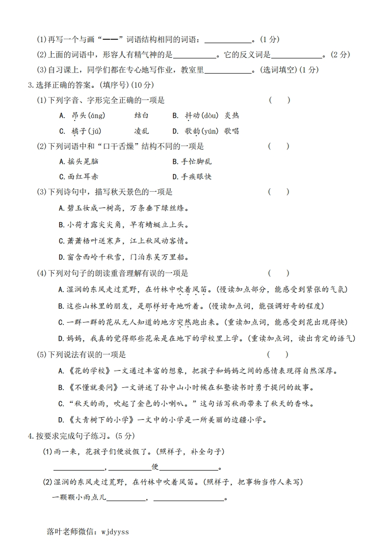 2025-2026学年三年级上册语文情境素养卷第一次月考卷时间:90分钟满分:100分为了拓宽同学们的知识面,学校开展了读书与实践交流活动,请你参加。一·阅读活动前言,完成练习。(17分)读书让我们受益匪浅。书中有shn()秋的luò()叶,它如同一méiméi()时邮piao(),邮来了秋天的凉爽(suǎng shudng);书中有高大的院墙(qian qiáng),那是用砖砌成的,砖块排1iè()得很guizé(),上面还绘有果园丰收的tiàn():书中有广阔的洞庭(t1ngy)湖--秋天的夜晚,风徐徐吹来,月光下的湖面好像一面wèi()经打磨(m6mo)的镜子一般迷人1.给加点字选择正确的读音,打“√”。(4分)2.根据拼音写字词。(8分)读①依照文字念。②阅3.根据右图给出的字典中“读”字的解释,给下列加点读,看书,阅览。③求学。字选择正确的解释。(填序号)(3分)①(字的)念法。读文章()读音(宣读(4.读画“一一”的句子,我会想到刘禹锡《望洞庭》中的诗句:“。”(2分)二·活动开始,同学们分组交流了自己的学习收获,请你按要求完成练习。(32分)1.用不同的方法理解句中加点的词语。(3分)()我憧憬着妹妹能够快快学会说话,期待她能叫我一声哥哥。用“近义词替换”的方法来理解词语的意思,句中的“憧憬”可以用“”来替换。(1分)(2)快轮到我上台演讲了,我的内心忐忑不安,生怕讲不好被同学们笑话。“忐忑不安”的意思是我是用“”的方法来理解的。(2分)2.把下列词语补充完整,并完成练习。(8分)()采飞()提()吊()製鸦雀()()()()发光落叶老师微信:wjdyyss