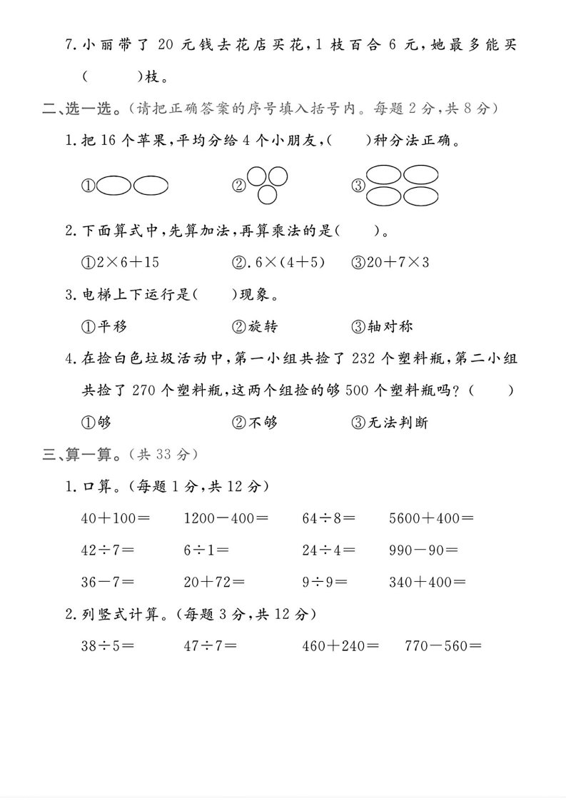 2024二升三人教版数学假期学习成果自评卷(一)(1)此内容为付费资源,请付费后查看