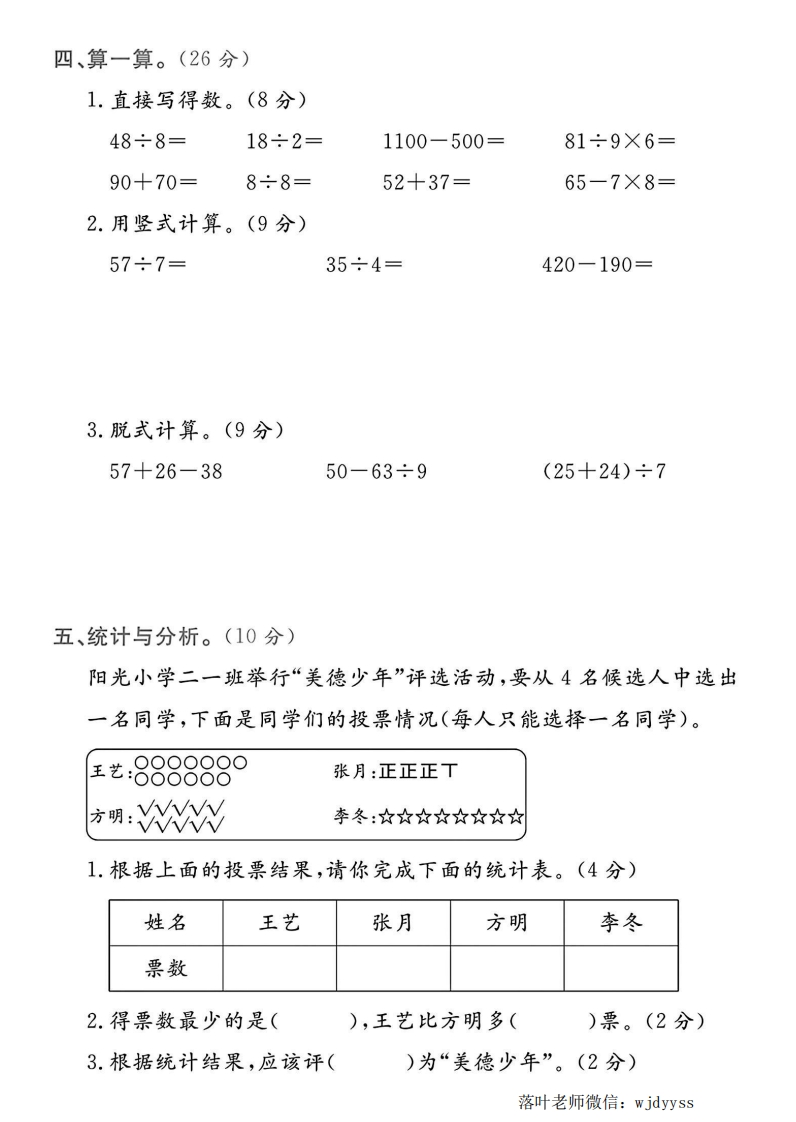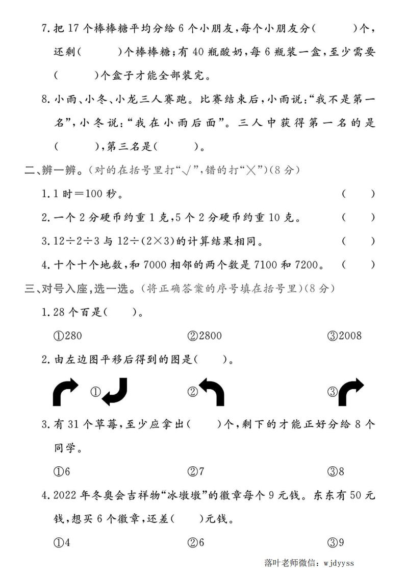 2024人教版三年级上册数学开学摸底考试(二升三)测试时间:90分钟测试分值:100分题号二三四五六总分得分一、填一填。(每空1分,共24分)1.由2个千、9个十和5个一组成的数写作(),读作()。2.在()里填上合适的单位。一个梨约重150()小丽的体重约是30(扬扬跑50米用了9(一节课40(3.在里填上“>”“<”或“=”。900克千克64÷83×220+8÷4(20+8)÷442÷724÷616÷46×5+96+5×94.下列是平移现象的在括号里画“○”,是旋转现象的在括号里画“△”。开车时方向盘的转动(电梯门的开关(算盘上珠子的上下运动(风车的转动(5.幼儿园老师买了20袋糖果,如果4袋糖果重1千克,这些糖果约重()千克。6.△☐☐□△□☐□△☐☐口△☐按这样的规律摆下去,第21个图形是(),第28个图形是()。落叶老师微信:wjdyyss