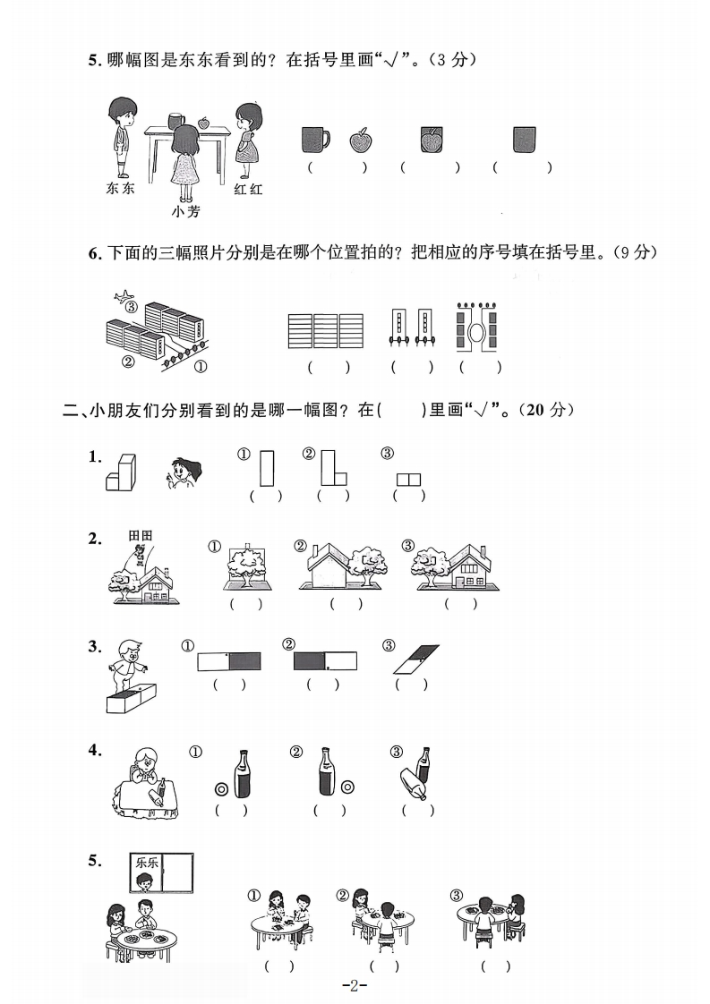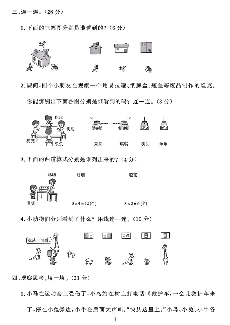 2025北师大版三年级上册数学第四单元测试卷(3)(1)tangqi883天前发布关注私信2.03MB6页02010 第1页 / 共6页 第2页 / 共6页 第3页 / 共6页 试读已结束,还剩3页,您可下载完整版后进行离线阅读 2025北师大版三年级上册数学第四单元测试卷(3)(1)此内容为付费资源,请付费后查看¥9.9¥19.9VIP会员免费立即购买您当前未登录!建议登陆后购买,可保存购买订单付费资源© 版权声明本站是一个信息分享及获取的平台,不确保部分用户上传资料的来源及知识产权归属,资料由老师投稿,公开渠道整理,网友上传,如果侵犯到您的权益,请联系客服删除THE END教师资料 文本预览 2025秋季北师版三年级上册数学单元测试卷第四单元测试卷(时间:40分钟满分:100分+10分)题号二三四附加题总分等级得分孙、小小填空,奥秘多。(26分)1.小狗和小兔看到的分别是数字几?(4分)》密鋁封2.五角星各在大正方体的哪个面?(6分)》线黛3.下面的三幅图分别是谁看到的?在括号里写出他们的名字。(6分)小华小明一小红()养4.哪幅图是桥上的人看到的?(在里画“/”)(3分) 查看更多 收起部分 喜欢就支持一下吧点赞10 分享QQ空间微博QQ好友海报分享复制链接收藏