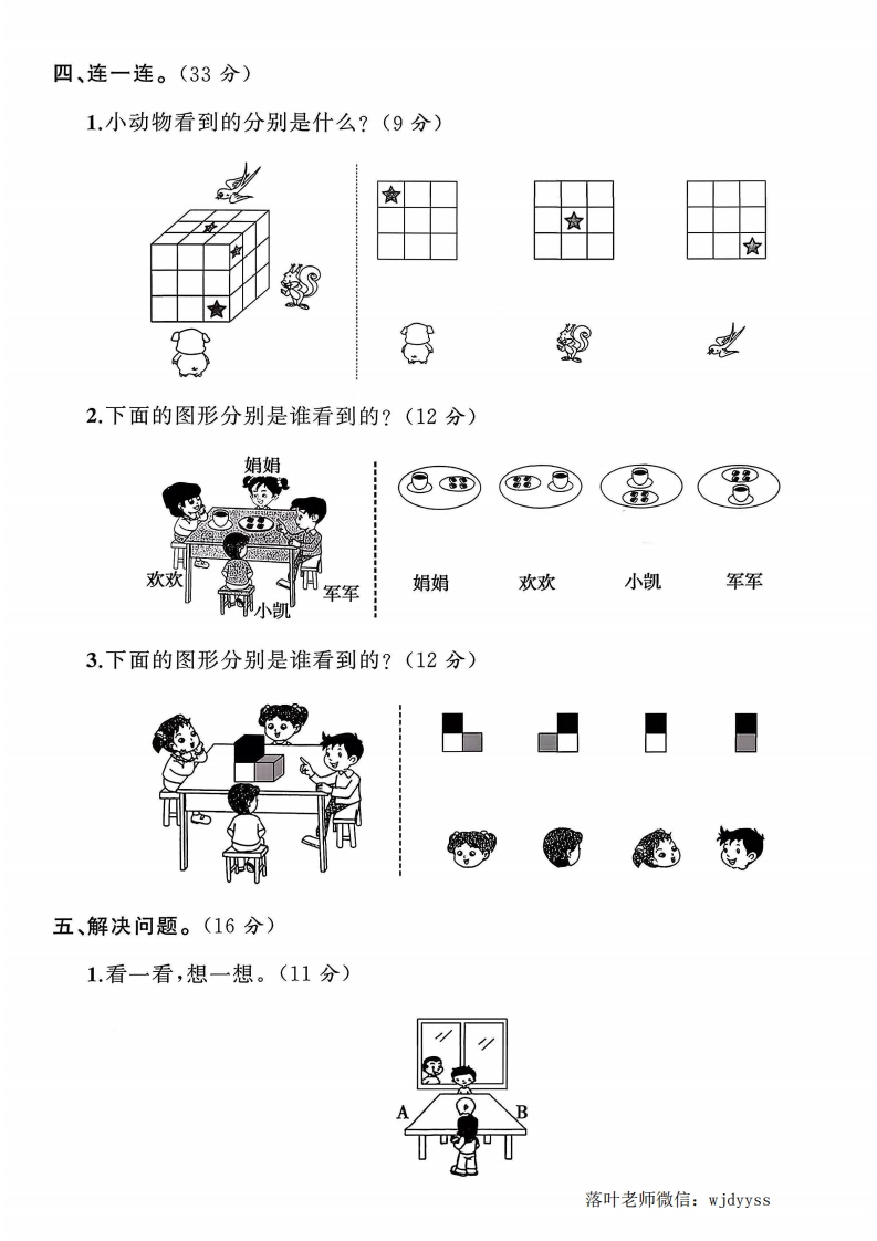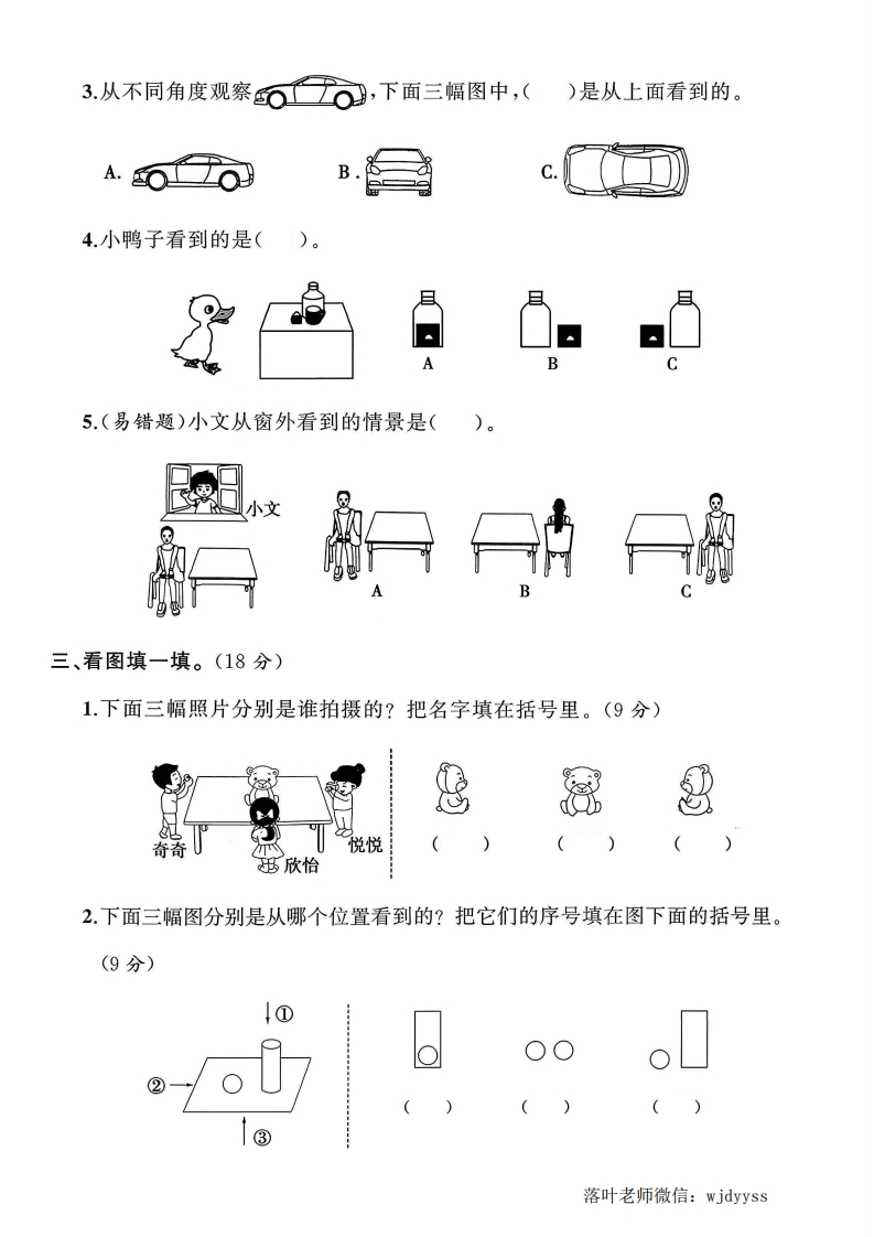 2025北师大版三年级数学上册单元测试卷第四单元测试卷时间:90分钟满分:100分+10分题序二三四五附加题总分得分一、填空题。(每空2分,共18分)弥1.晨晨站在不同位置给拍照,每个位置拍到的照片()。(填“相同”或“不相同”)封2.美术课上,同学们观察讲桌上的一个正方体。从一个方向每次最少能看毁到正方体的()个面,最多能看到正方体的()个面。线3.观察图形填空。(填序号)内茶叶不①②③⑤(1)从前面看是正方形的是(),是长方形的是(),是圆形的要是()。(2)从上面看是正方形的是(),是长方形的是(),是圆形的是管(案二、选择题。(将正确答案的序号填在括号里)(15分)题1.下面三幅图中,()是兰兰看到的。兰B文文2.下面的立体图形中,无论我们站在哪个角度观察,看到的都一样的是(A.球B.长方体C.圆罐落叶老师微信:wjdyyss