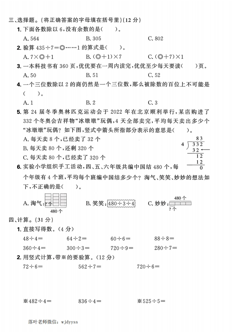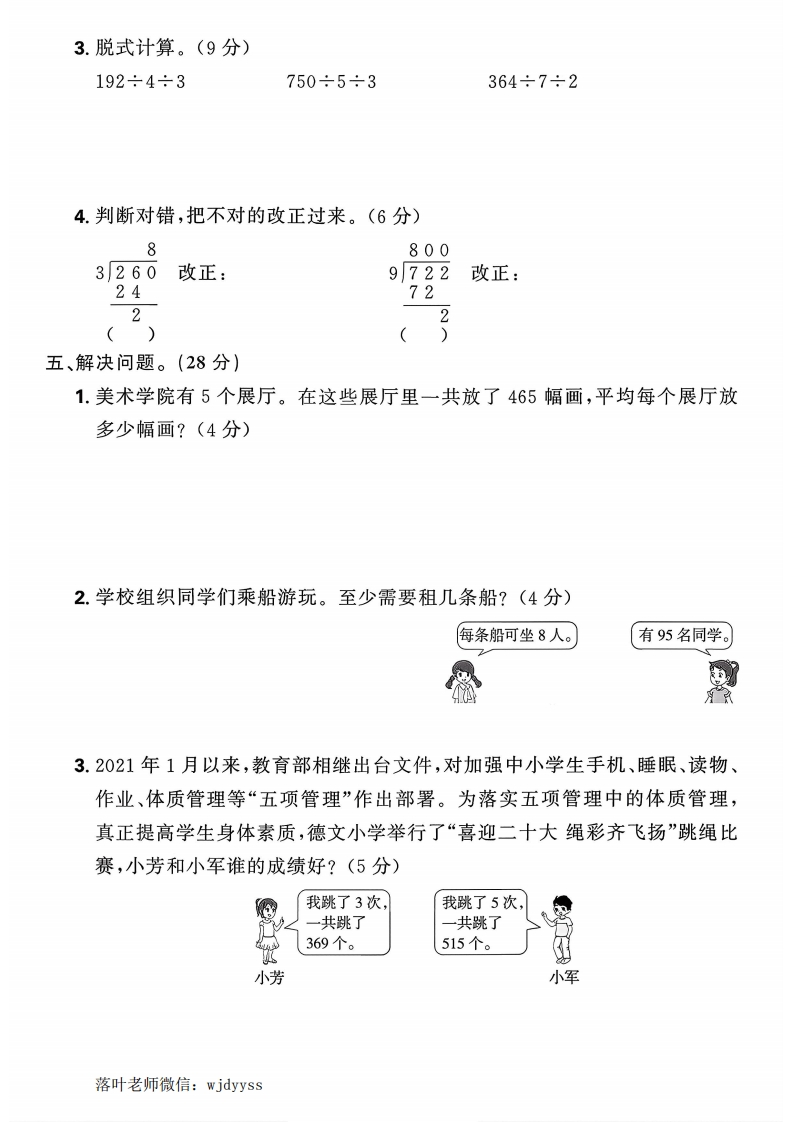 2025秋季冀教版三年级上册数学单元测试卷第四单元测试卷时间:40分钟满分:100分+10分题号二三四五附加题总分等级得分一、填一填。(24分)】孙1.口算350÷7时,可以想7X()=350,也可以想把()个十平均分成()份,每份是()个十,就是()。密2.358÷4的商的最高位是()位,商是()位数。3.从847里面连续减去7,最多能减()次,结果是0。4.3除6☐3,要使商的中间有0,☐里可以填()。5.☐74÷6,要使商是两位数,口里最大可以填();要使商是三位数,口里最小应该填(封)。6.在☐÷6=125…☐中,余数最大是(),此时被除数是(7.在(○里填上“>”“<”或“=”。684÷6(●855÷525×6○576÷4138276÷2线475÷3○152342÷3○400÷5320÷4○180÷38.一个笔记本6元,200元最多能买()本,买150本需要()元。9.倩倩买9支钢笔花了63元,琪琪买了一些同样的钢笔,花了140元,她买了()支钢笔。10.有一组图形按规律排列:(第46个图形是(),第485个图形是()。二、判断题。(对的画“/”,错的画“X”)(5分)1.215÷3的商是三位数。(2.被除数的末尾有两个0,商的末尾一定有0。(3.三位数除以一位数,结果不可能是两位数。4.两个数相除的商一定小于这两个数相乘的积。5.一个三位数除以8,商是三位数,被除数最高位上的数可能是7。()落叶老师微信:wjdyyss