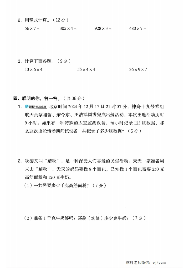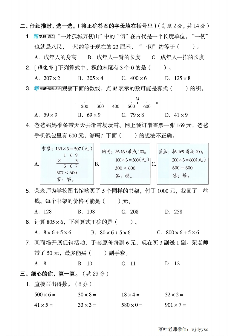 2025冀教版三年级数学上册单元测试卷第二单元测试卷时间:70分钟满分:100分+10分好一、认真审题,填一填。(每空1分,共21分)1.将下列数线图写成乘法算式是()×()=(+40+40+40040801202.[邯郸市]最大的一位数的13倍是();最大的一位数与最大的两位数的积是()。3.1支笔4元,买21支这样的笔要花多少元?可以用下面的竖式计算,框中的“8”表示的是()支这样的笔的钱数。21×44.在(里填上“>”“<”或“=”84警502×8400078×578×4456×0456+0400×9600×6205×4210×5220×4360×35.两个数相乘,积是240,其中一个乘数不变,另一个乘数扩大到原来的4倍,此时积是()。6.[迁安市]学校组织三年级150名师生开展游学活动,租了5辆汽车,每辆汽车有36个座位。每人一个座位,够吗?()(填“够”或“不够”),我是这样估算的:()國7.新考法算理算法如图是天天笔算208乘4的过程。典典看到后说:“这题你馨算错了,你这里的208乘4中的‘2’乘‘4’等于8个(2084所以208乘4的得数应该为()才对。”80328.一辆货车载重7吨,3辆这样的货车4次()(填“能”或“不能”)运完100吨货物。9.学科素养推理意识找规律,在括号里填上合适的数。1×8+1=912×8+2=98123×8+3=9871234×8+4=()=98765落叶老师微信:wjdyyss