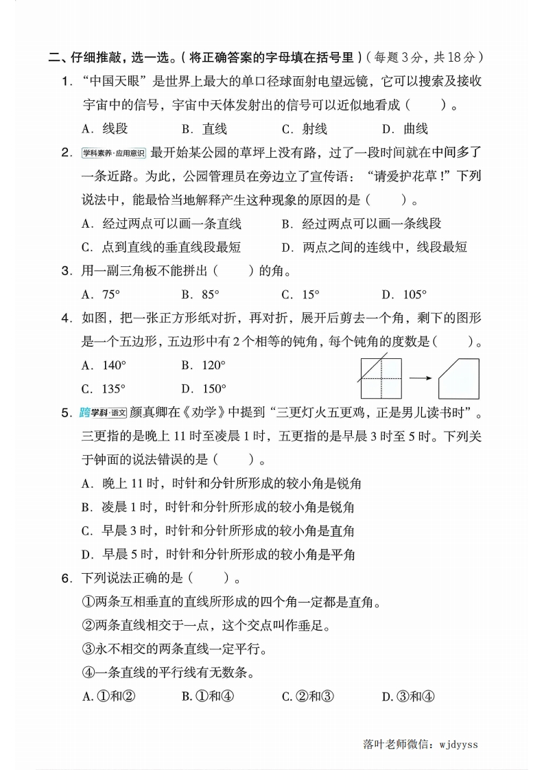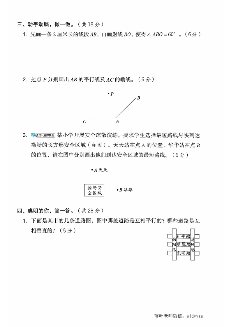 2025冀教版三年级数学上册单元测试卷第三单元测试卷1111111时间:70分钟满分:100分+10分如一、认真审题,填一填。(每空2分,共36分)1.如图,互相平行的是(),互相垂直的是()。(填序号)11,②③5⑥部2.新情境交通安全遵守交通规则,要学会看交警手势。下列手势中的角,是锐角的有(),是直角的有(),是钝角的有(),是平角的有()。(填序号)11111111,警①②④3.立定跳远成绩为最近的落地点到起跳线的距离。如图起②是龙龙在体育课上立定跳远后留下的脚印,他的跳远跳③)线④成绩是()号线段的长度。4.右图中有()条线段,有()条射线,有(条直线。5.不用量,直接写出每组中2块三角板组成的角的度数。兰1=(∠2=()6.如图,找图形,并用字母和符号表示出来。锐角:()直角:(钝角:()A互相平行:()互相垂直:(B7.梦梦用量角器测量一个角时,在测量方法正确的情况下,原本该读内圈的刻度,结果错读成了外圈的刻度,读成了150°,则这个角正确的度数是()。落叶老师微信:wjdyyss: