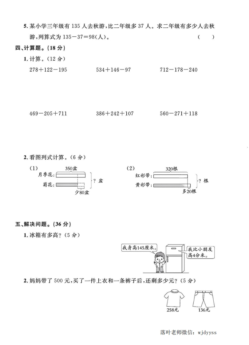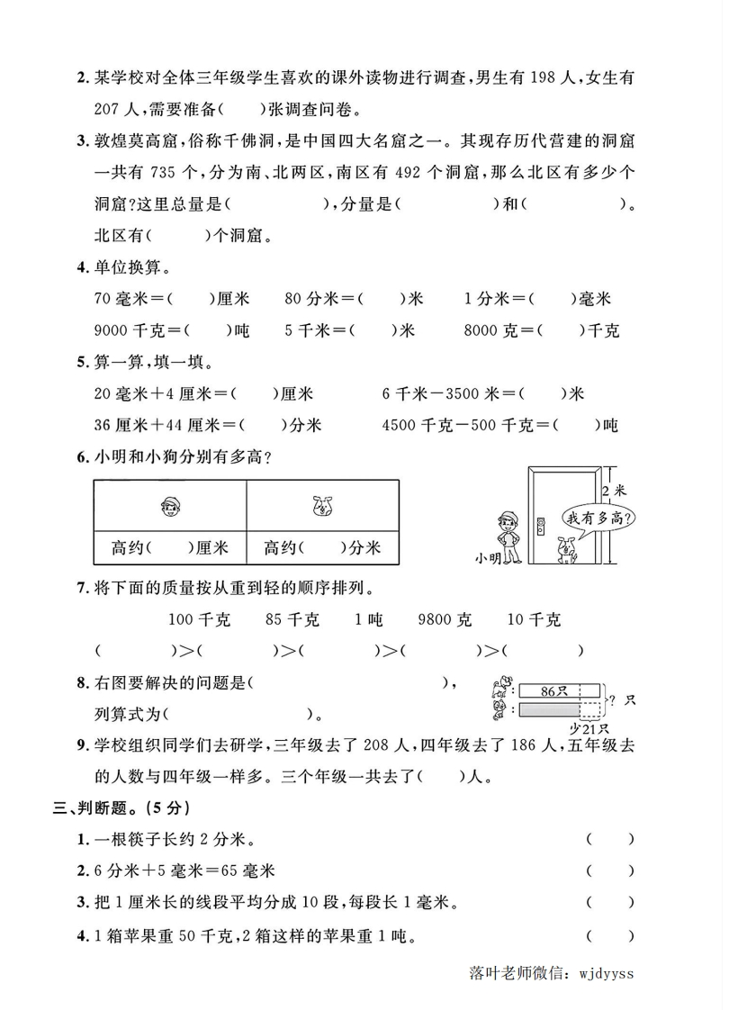 2025青岛63版三年级数学上册第一次月考卷(检测范围:第一、二单元)(时间:60分钟满分:100分)评价:一、选择题。(14分)1.某日,某地区突降暴雨,3小时内降雨量达110(),导致部分地区发生内涝。A.毫米B.厘米C.分米2.下面选项中,与1吨最接近的是()。A.999克B.1003克C.1003千克3.写字时要做到“一尺一寸一拳头”,这里的“一尺”就是写字时眼睛和书本的距离约是()比较合适。A.33分米B.33厘米C.33毫米4.学校操场跑道一圈长400米,奇奇跑了2圈,再跑()米就是1千米。救A.600B.400C.2005.广州塔高600米,比东方明珠塔高132米。东方明珠塔高()米。A.732B.478C.4686.甲瓶里有果汁600克,乙瓶里有果汁1千克。从乙瓶向甲瓶倒()克,两瓶果汁就同样重。制A.200B.300C.4007.文具店里有220支铅笔,铅笔和钢笔一共有多少支?横线处应填的信息是()。A.钢笔比铅笔少120支B.每盒铅笔5元C.有20盒钢笔二、填空题。(27分)】1.下面这支铅笔长()厘米,它的长度要比1分米短()毫米。孙1678910落叶老师微信:wjdyyss