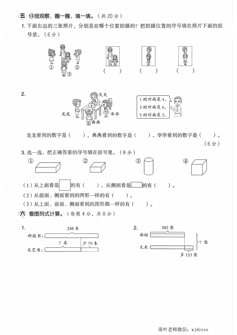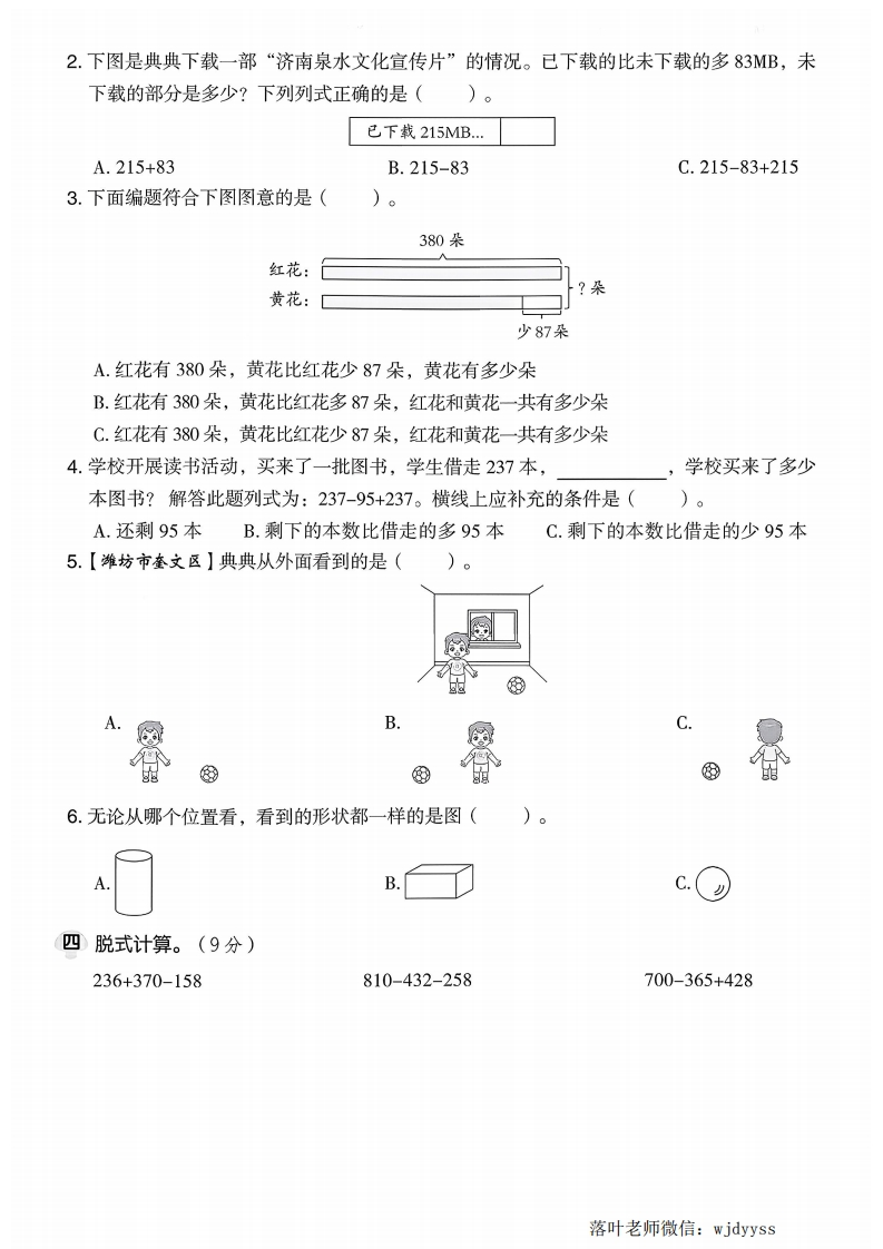 2025青岛63制三年级数学上册第2、3单元测试卷时间:60分钟满分:100分一填空。(每空2分,共18分)1.新情境人文景观曲阜是孔子的故乡,被誉为东方圣城,潍坊市某学校组织752名三、四年级学生到曲阜进行“三孔”研学活动,三年级有387人,四年级有多少人?此题数量关系%中表示总量的是(),表示分量的分别是()和()。解决此题的总量与分量的关系是()。2.新情境航空航天动物们一起庆祝神舟十九号发射成功,猜一猜它们分别能看到什么字。弥)能看到“航”字,()能看到“庆”字,()能看到“天”字。小蜜蜂航小狗小老虎3.梦梦有3条不同的裙子,还有2双不同的鞋子,鞋子和裙子可以有()种不同的搭配。封4.王奶奶家的防盗门的密码如下图所示,有一天王奶奶只记住了前面的3个数字,后面3个数字只知道是3、6、9,不知道顺序,那么王奶奶最多试()次就可以打开防盗门。8二下图是三名同学从不同的角度看到的一间房子的情况,根据观察到的信息判断下列说法的正误。(对的画“V”,错的画“×”)(8分)斑典典梦梦蓝蓝1.典典是站在房子的前面观察的。线2.蓝蓝和梦梦是站在房子的侧面观察的。3.这间房子一共有一扇窗户,一道门。4.房子的侧面有一扇窗户。(三选择。(将正确答案的字母填在括号里。每题2分,共12分)1.从不同位置观察下图,看到的形状不可能是(A.长方形B.正方形C.圆落叶老师微信:wjdyyss