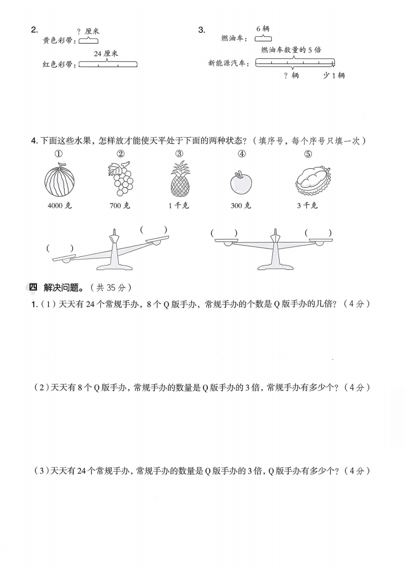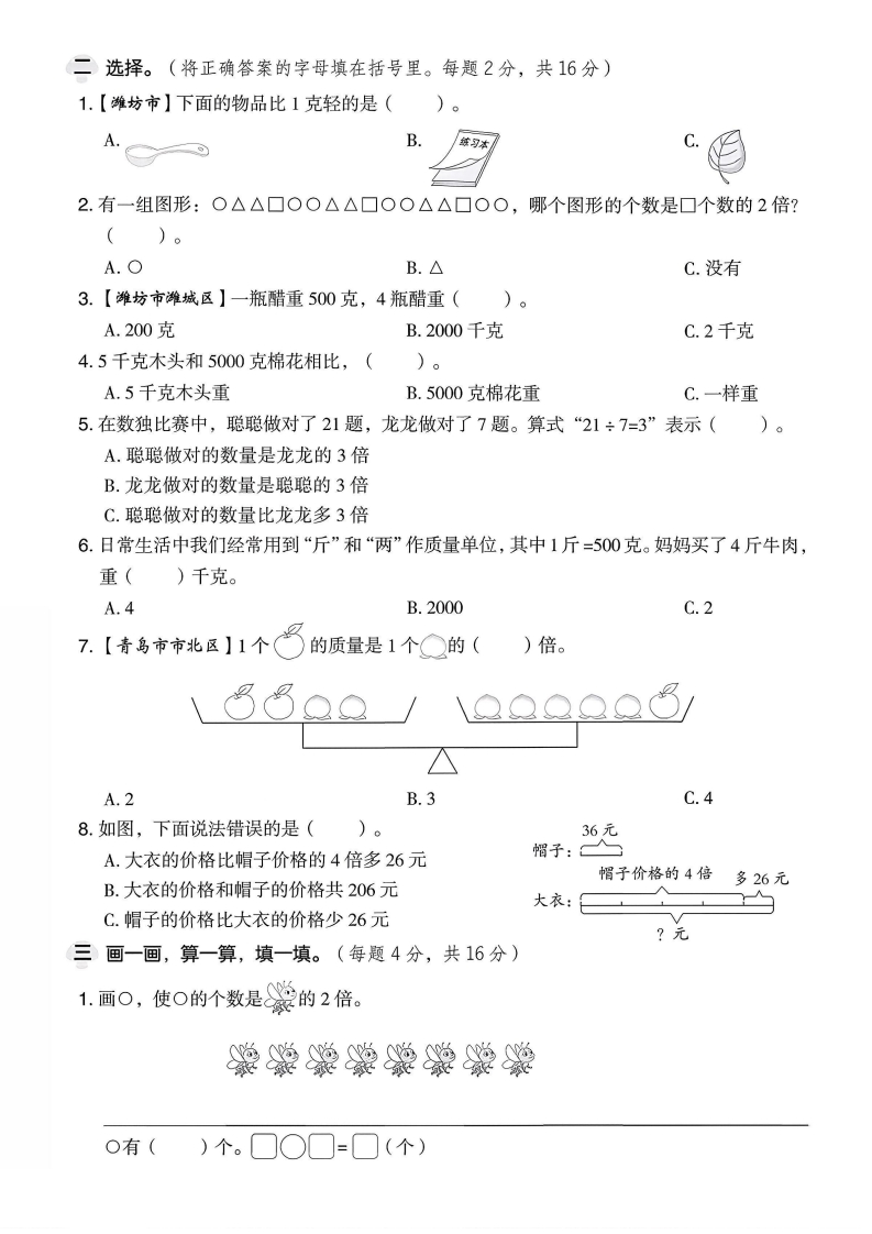 2025青岛63制三年级数学上册第四单元测试卷时间:60分钟满分:100分一填空。(每空1分,共33分)1.在括号里填上合适的质量单位。敬5()200(8()30(弥2.56是7的()倍;()是7的8倍;56是()的8倍。6的4倍是(比6的4倍多5的数是();比6的4倍少5的数是()。3.2000g=()kg9吨=()千克6吨+80千克=()千克5千克+380克=()克製1吨-300千克=()千克8600千克-3600千克=()吨4.在(○里填上“>”“<”或“=”。999千克○1吨9000千克(○9吨4900克(○5千克5.称一称,填一填。封100g50g凸昌200(6.【青岛市崂山区】把下面的质量按要求排列。4克4吨40千克4004克4千克()>()>()>()>()批7.1桶水大约重10千克,10桶水大约重()千克,()桶水大约线重1吨。8.同同和妈妈每年会制作1个非遗工艺品,同同到今年为止制作了5个,妈妈到今年为止制作了35个,妈妈制作的非遗工艺品数量是同同的()倍,明年妈妈制作的工艺品数量是同同的()倍。9。新闸度·补充条件潍坊萝卜和辉渠小米都是濉坊著名的特产,李阿姨(),卖出的潍坊萝卜比辉渠小米的2倍少2箱,李阿姨卖出多少箱潍坊萝卜?华华用算式28×2=56(箱),56-2=54(箱)来解决这个问题,请你根据她的解答过程在括号里填上合适的条件。